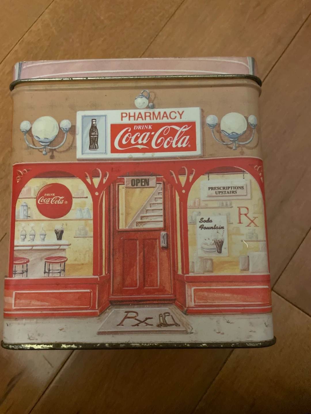 Selling a vintage Coca-Cola tin box with a cute pharmacy design! It's got some wear and tear, but it's still a charming piece for any collector or Coca-Cola enthusiast