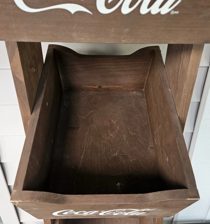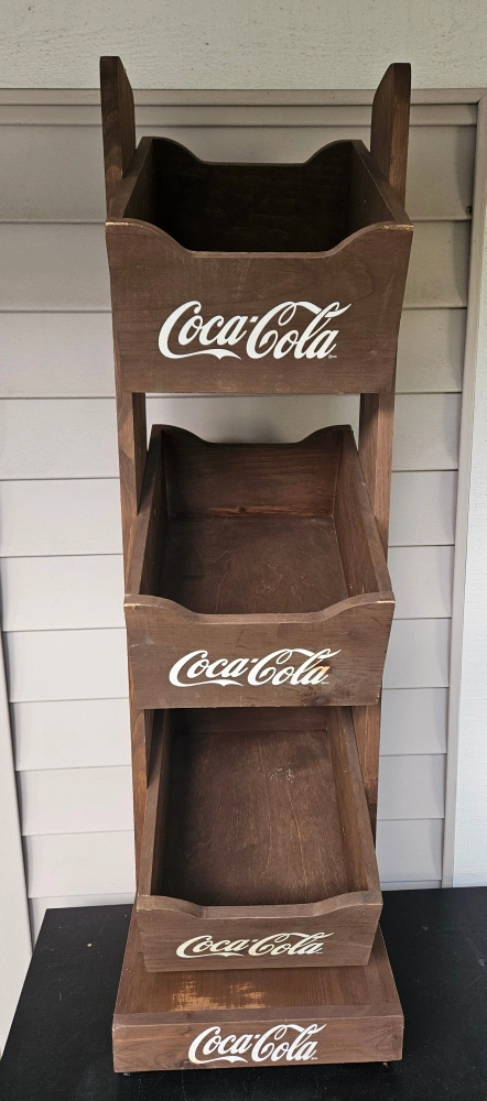 1000+Coca Cola Wooden Display Case This display is made of solid wood and all wooden pieces are intact. There are 3 open compartments display. The Coca Cola text/font is on both sides and on the front of each box. The measurements of this Coca Cola wooden display case are 48” Tall x 15” Wide x 15” ( each basket measures at 15” depth x 12” wide x 7” high.
