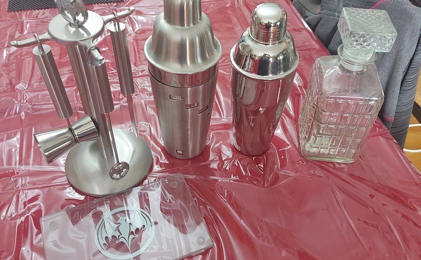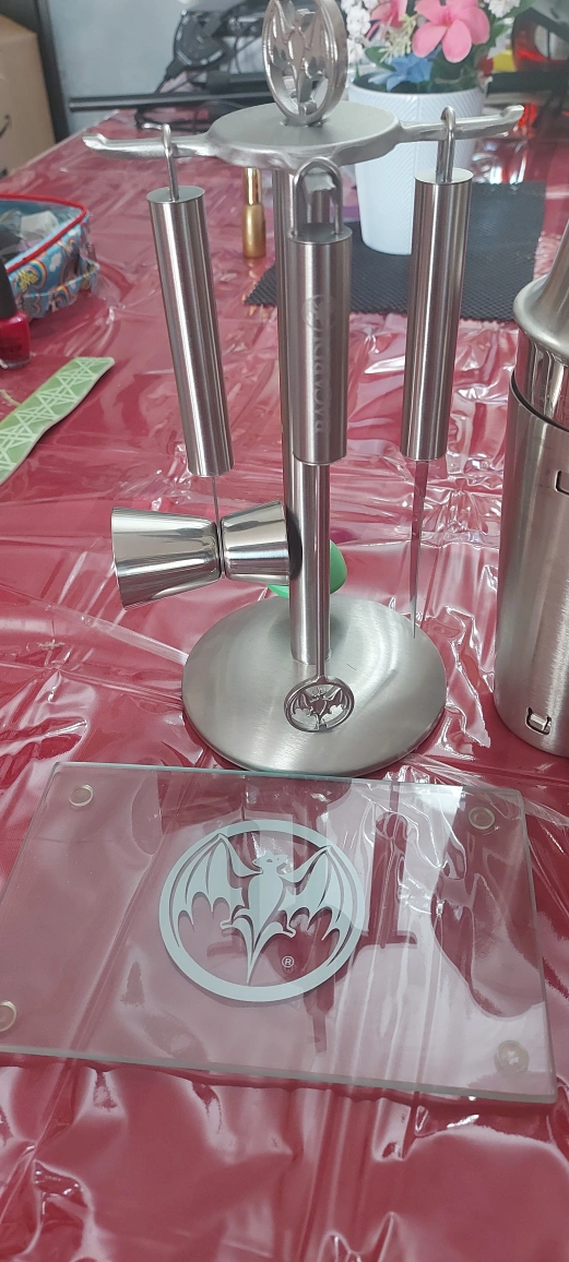 Selling a cocktail shaker set! It includes the shaker, a stand with bar tools, and a Bacardi cutting board new never used. the carafe is a free bonus used 1 time but clean cash only