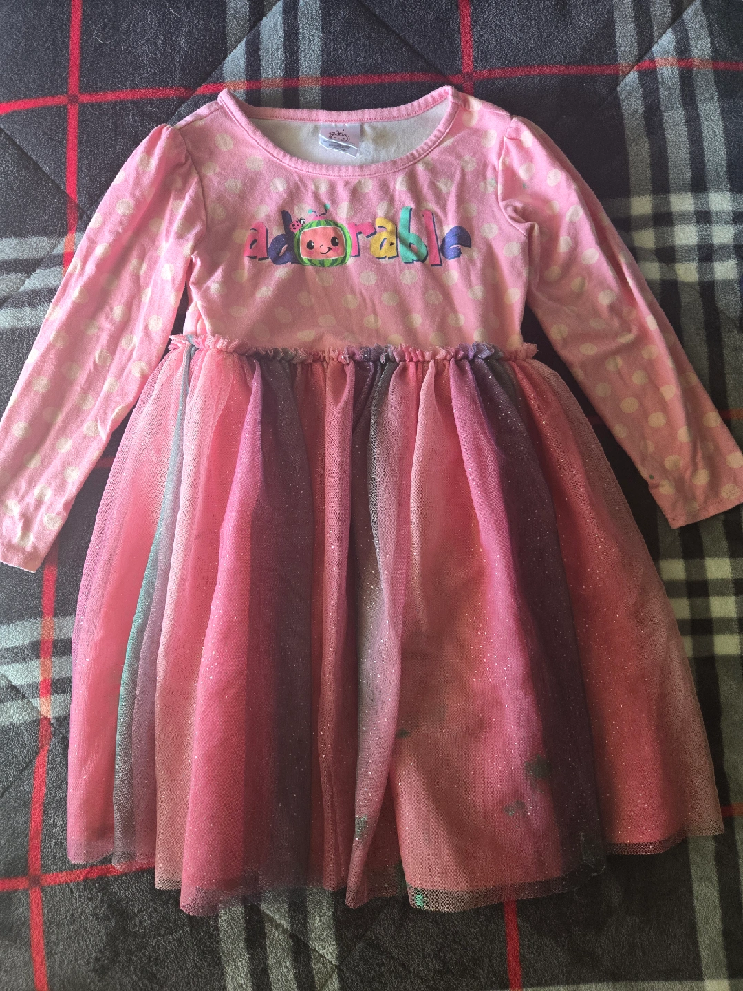 18Selling a cute Cocomelon dress! It's pink with white polka dots on the sleeves and top. The word "adorable" is written across the chest with a Cocomelon character. The bottom is a colourful tutu with shades of pink and purple. Perfect for a little Cocomelon fan! 5T