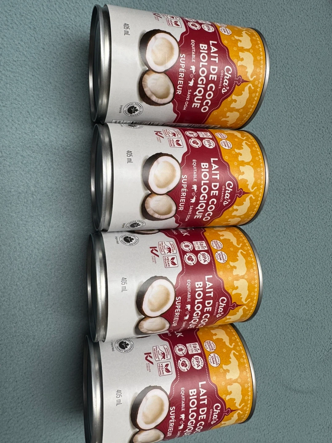 Selling 4 cans of Cha's Organics Lait de Coco Biologique (Organic Coconut Milk). Each can contains 405 mL. Perfect for cooking and baking!