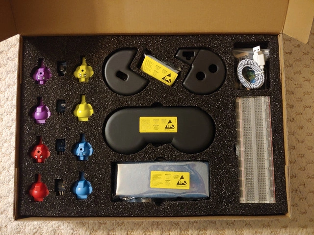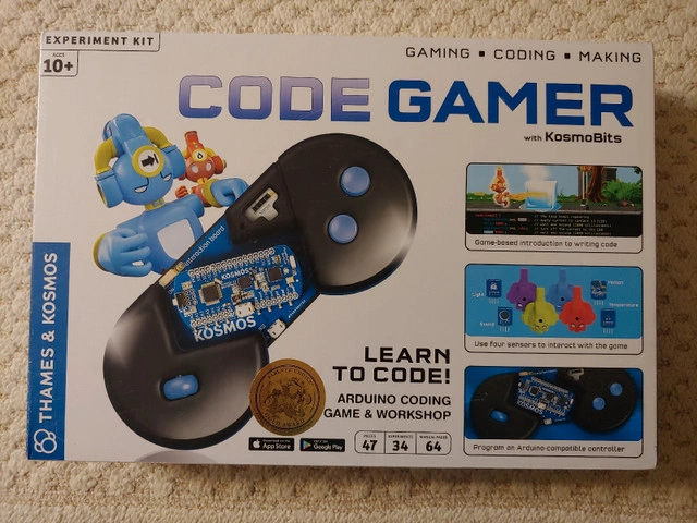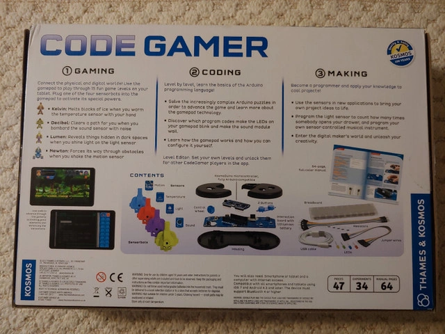 New open box. The parts are still sealed. This kit introduces you to programming in a fun, step-by-step way. An Arduino-compatible gamepad connects wirelessly to your tablet (sold separately). Using the gamepad and four interchangeable sensor modules, you play through a video game app on your tablet. In each level of the game, you have to learn a piece of the Arduino programming language and how to use it in order to solve puzzles and challenges and move forward in the game. In this way, you progressively learn the basics of coding. Soon you will be able to write programs on your computer using the four sensors and invent new applications. Following the instructions in the 64-page, full-color experiment manual, you can create cool projects such as a light-sensitive drawer alarm and an LED disco light that reacts to the movements of your fingers. 64-page, full-color manual 47 pieces 34 experiments For use with iOS and Android devices What's In the Box? Contents: KosmoDuino microcontroller, fully Arduino-compatible Interaction board with lithium-ion battery Gamepad housing Control wheel for the gamepad 2 buttons for the gamepad Light sensor Sound sensor Temperature sensor Motion sensor Housing for the 4 sensors Breadboard Jumper wires Resistors LEDs (yellow, green, blue, and red) USB to Micro-USB cable 64-page experiment manual Quickstart Guide