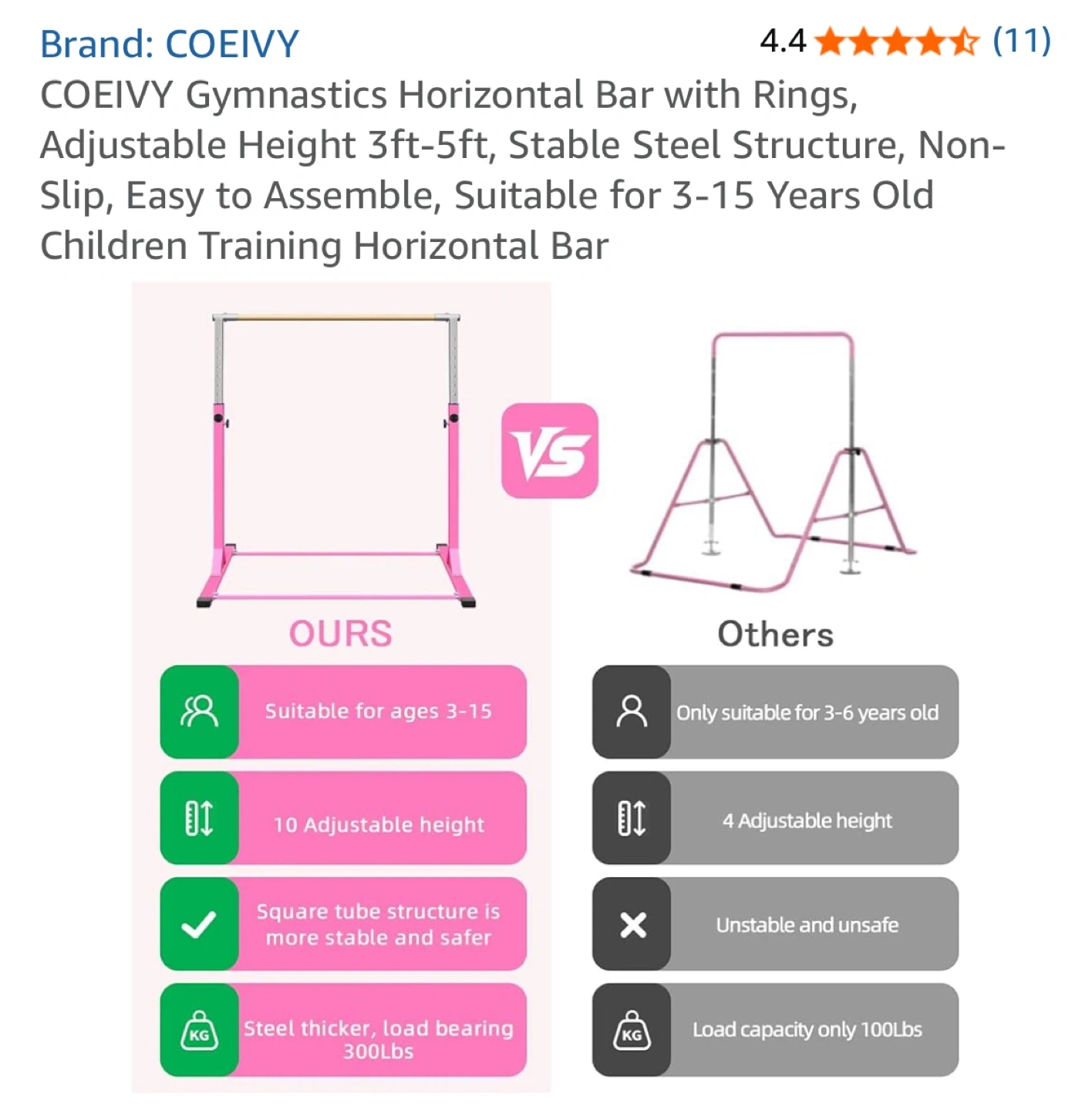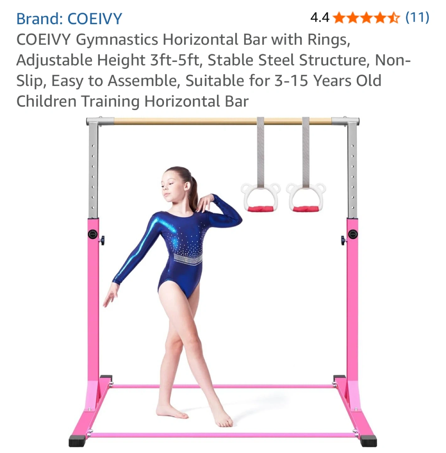145High Quality Material】The support bar is made of thick square steel pipe, the horizontal bar has a load-bearing capacity of up to 300 pounds, and both ends are equipped with non-slip rubber to ensure that the horizontal bar grips the floor tightly and maintains stability. 【Simple and Stylish】The color matching is stylish and vibrant, suitable for home, school, gymnasium and other places. The gymnastics bar comes with an installation manual, which is super simple to assemble and operate. (With 2 gymnastics rings) 【Adjustable Height and Easy Assembly】The height of this gymnastics equipment can be easily adjusted 35 inches - 54 inches Easy to operate (tighten all screws to prevent the gymnastics bar from shaking) 【Enjoy Gymnastics】This gymnastics horizontal bar is a great gift for children's healthy growth and improving body coordination. Children will be keen to master new gymnastics skills and grow in fun and exercise. 【Responsible for the Product】We wholeheartedly provide 100% satisfaction to every valued customer. If you have any questions about the product, we will solve your problem quickly.