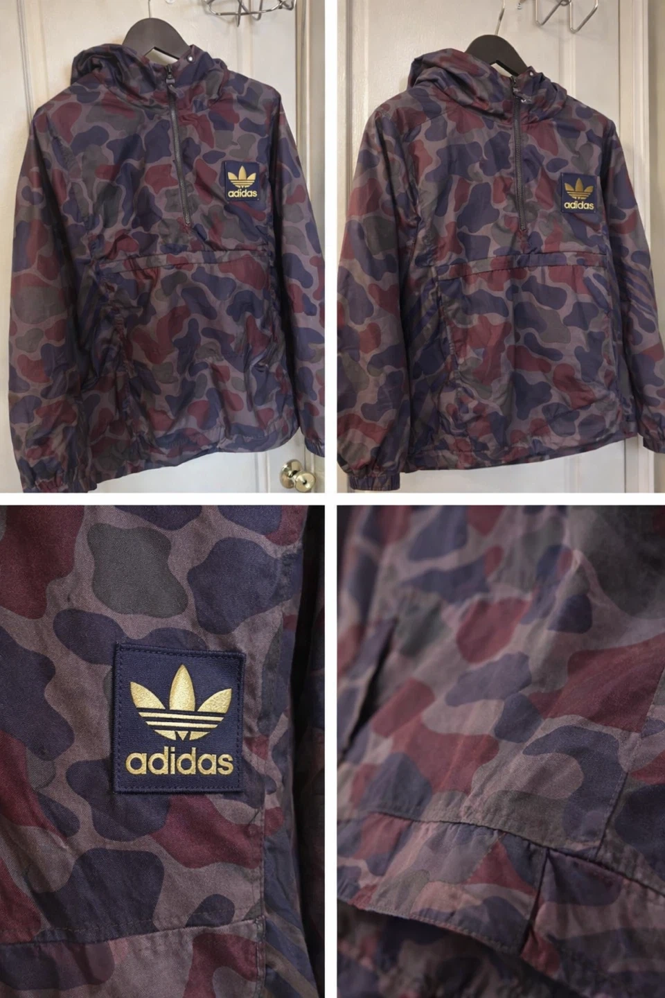 Lightweight Adidas anorak jacket with a camouflage pattern. It features a front pouch pocket and a half-zip closure. Material is windbreaker style fabric.