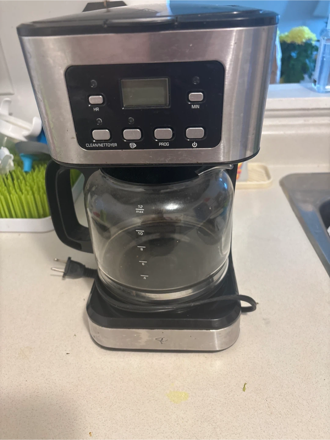 Selling a used coffee maker that can brew up to 12 cups! It has a digital display and programmable settings, so you can set it up to brew automatically. It also has a clean/nettoyer button.