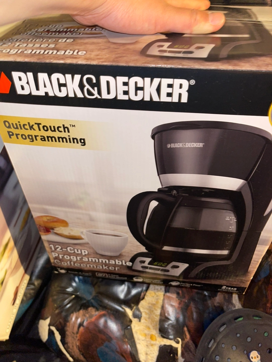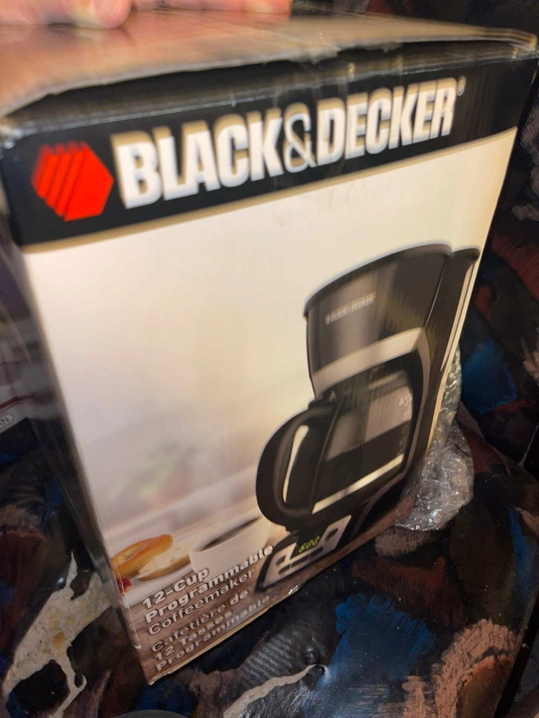 New Black & Decker 12-cup programmable coffee maker. QuickTouch programming. Features a glass carafe. Still in original packaging. Cash only Pick up Dundas and Spadina.