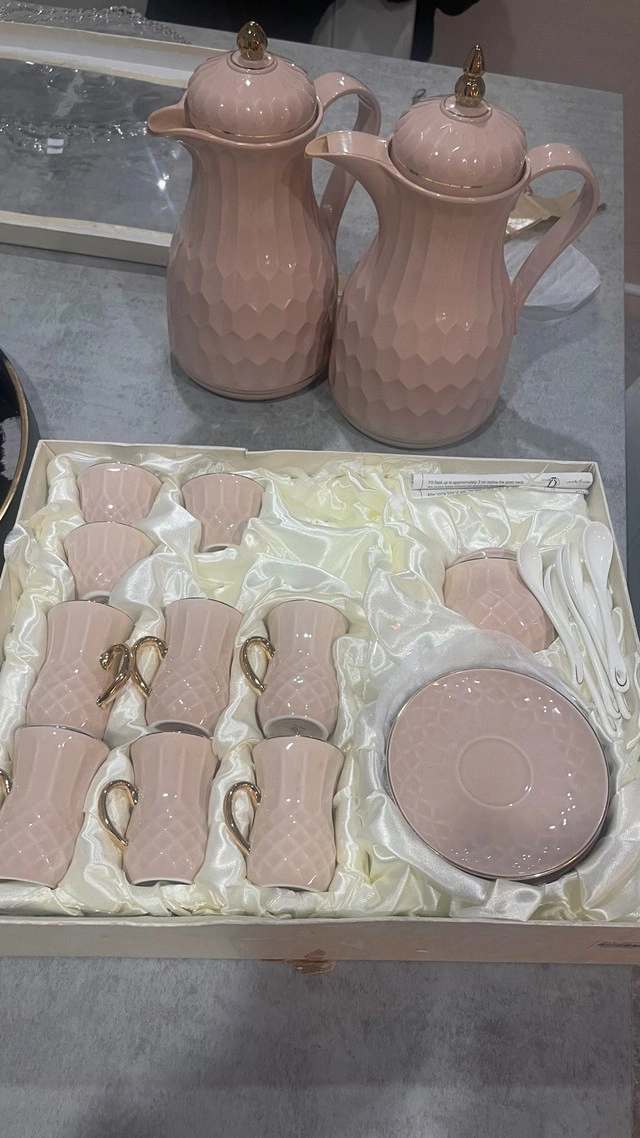 5Elevate your coffee service with this elegant set, perfect for serving traditional Arabic coffee. This set has never been used and includes two thermal pitchers and a complete set of matching cups and saucers. The set comes in the original packaging as shown in the photos. * Two thermal coffee pitchers * Matching cups and saucers * Original packaging included This coffee set is priced to sell. If the ad is up, it's still available!