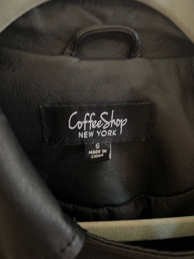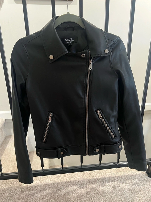 97Coffee Shop New York faux-leather black biker jacket, perfect for adding a touch of edgy style to any outfit. It is a size small. Never worn! Additional features include: * Asymmetrical zip closure * Silver-toned hardware * Zipped pockets. Let me know if you're interested!