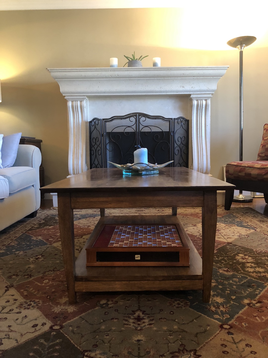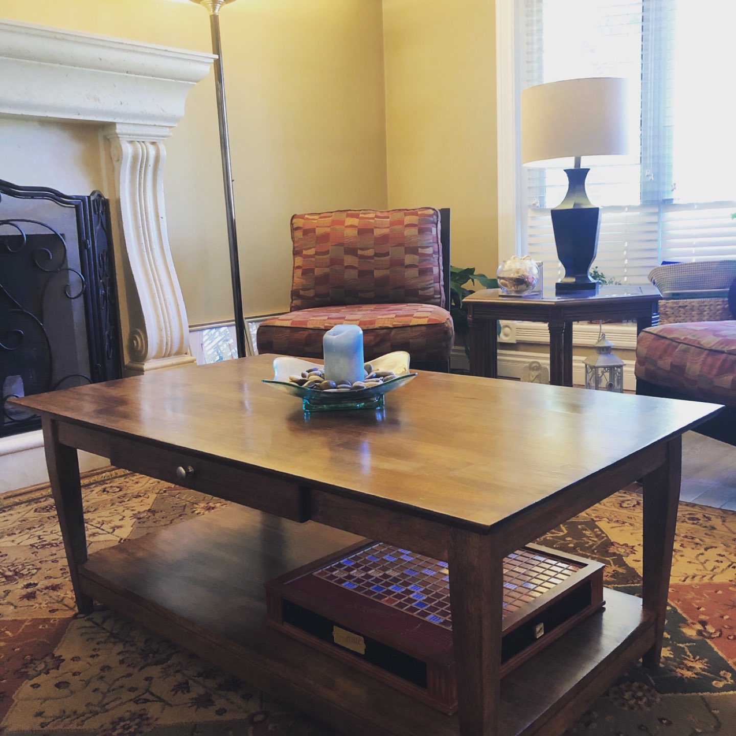 10This gorgeous newly refinished oak coffee table is available. Stained in a deep rich walnut with built in drawer for storage. Length: 48” Width: 28” Height: 19” Price: $150