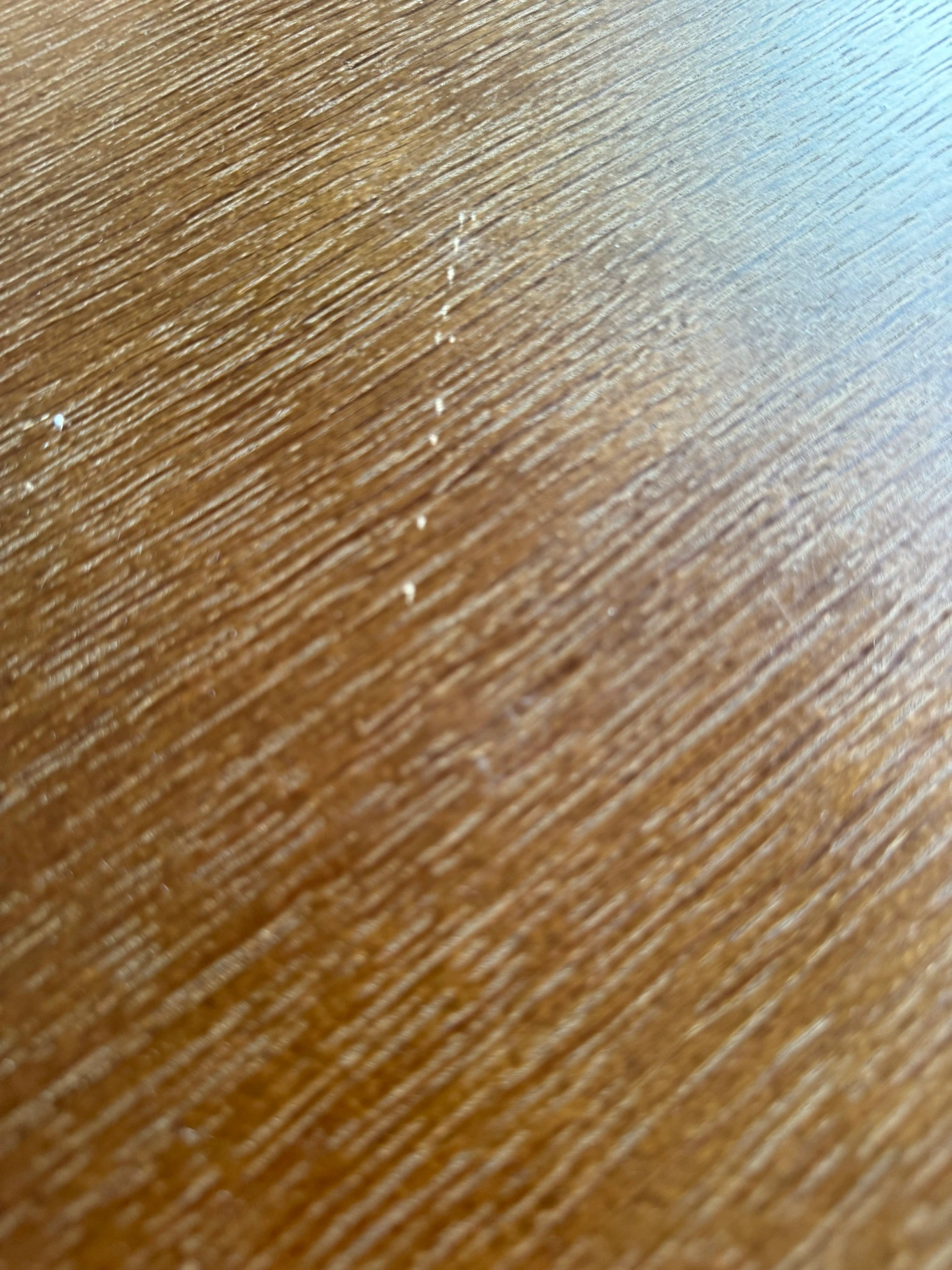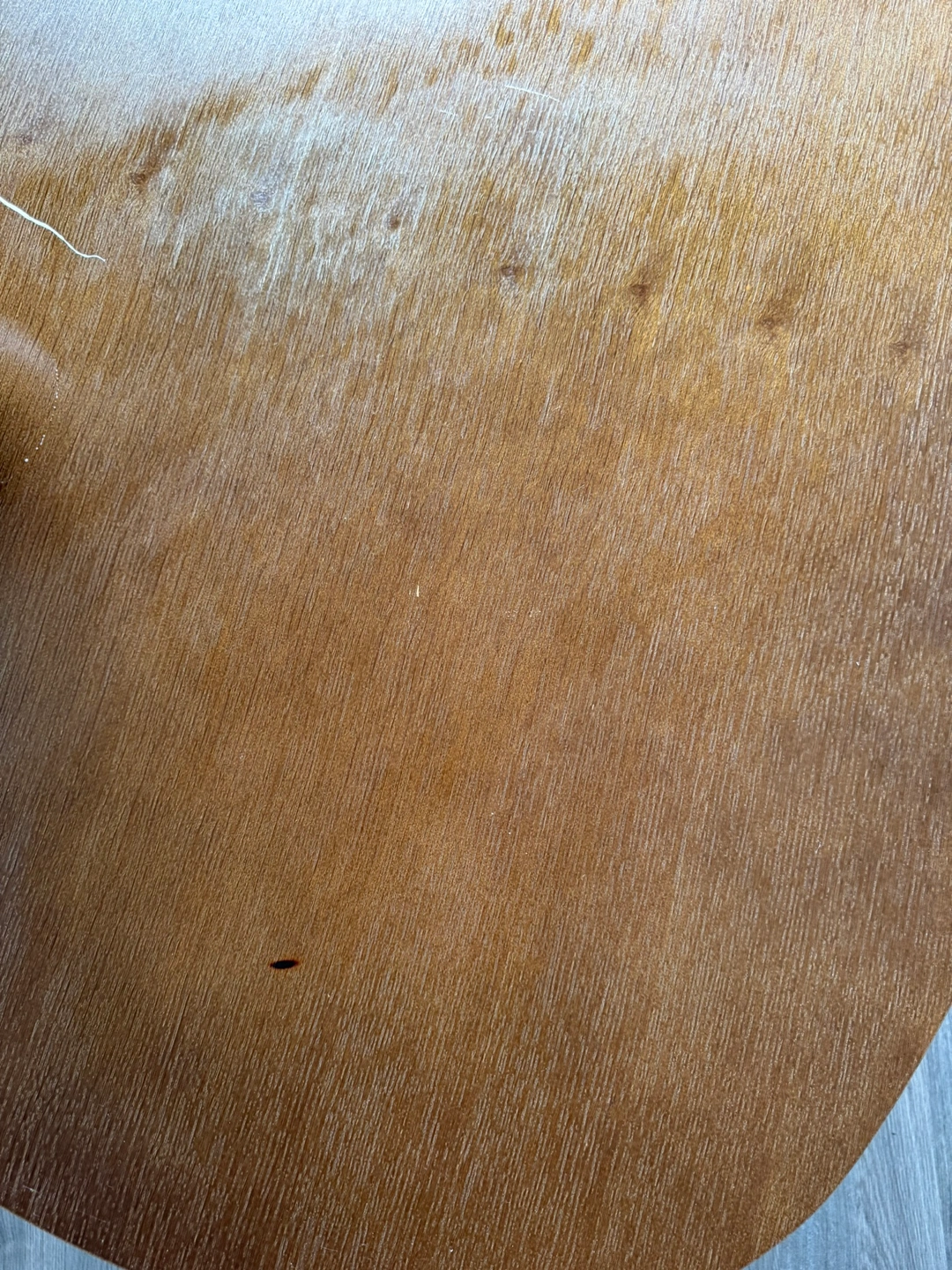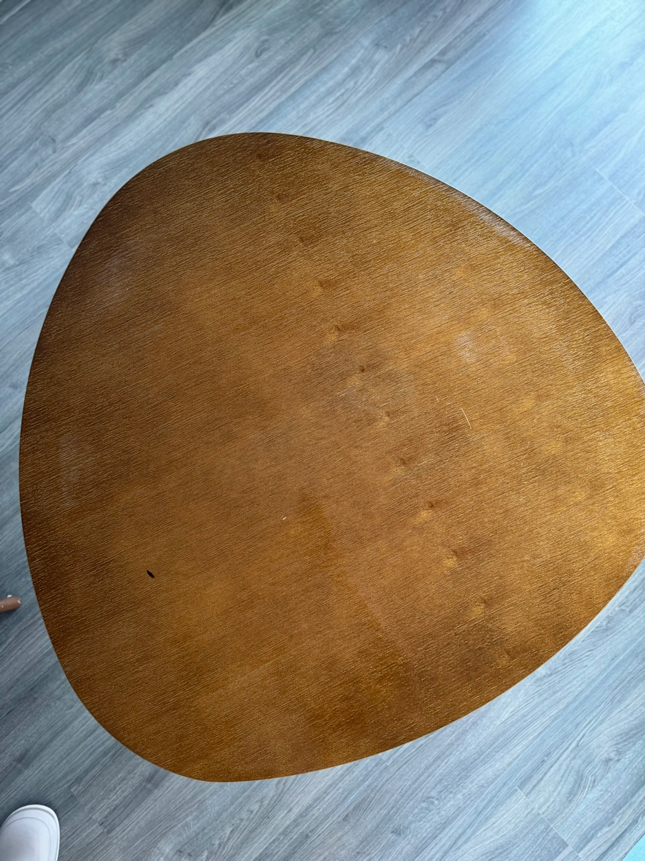 15A unique shaped, mid-century modern coffee table with a wood finish. It has four legs and a rounded, triangular top. It is in good condition. Height 35cm diameter 85cm
