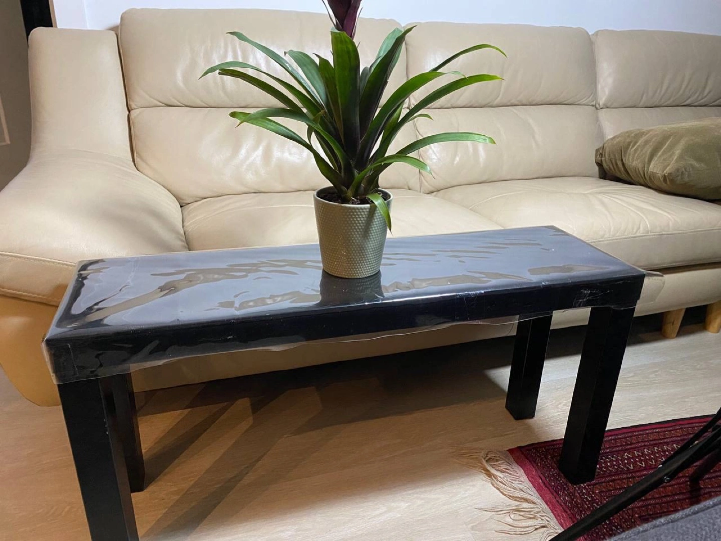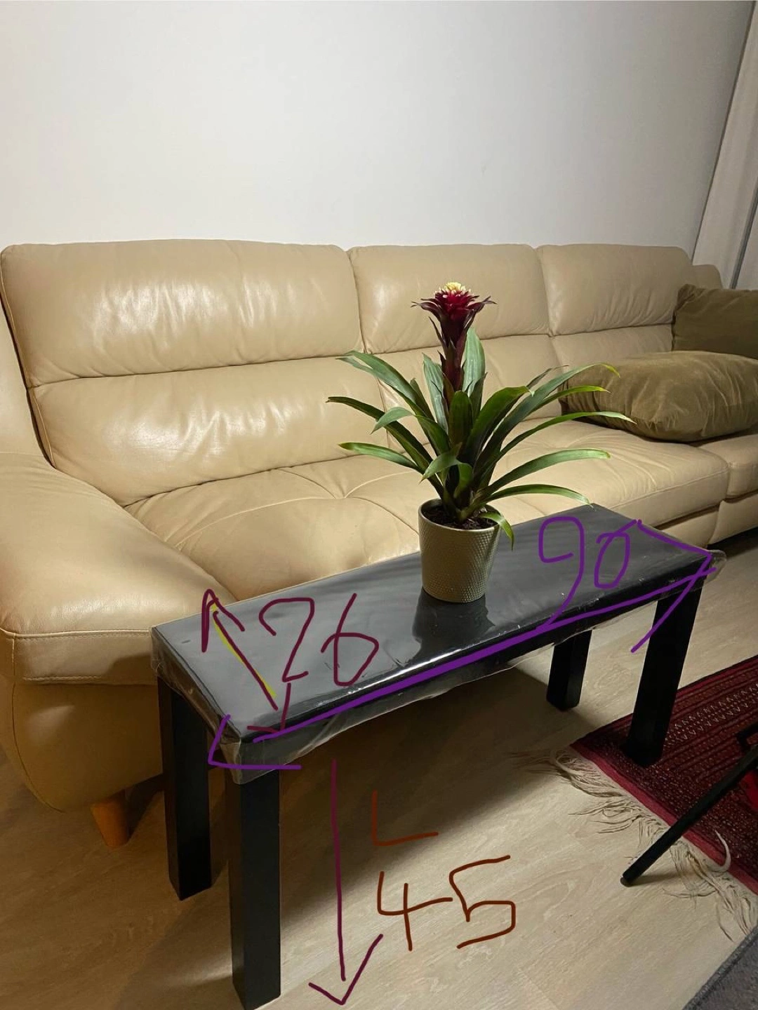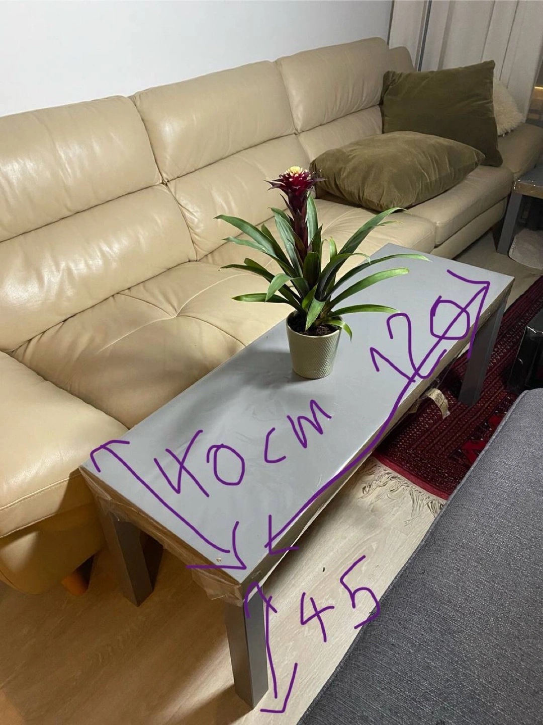 A modern coffee table. It features a rectangular tabletop with metal legs. The dimensions of the table are clearly marked in the provided images. It is a perfect table for a living room, adding a sense of calm to your home.