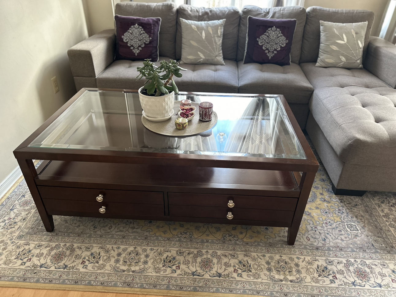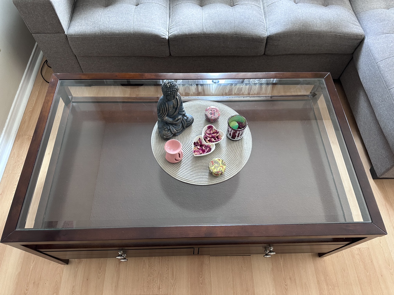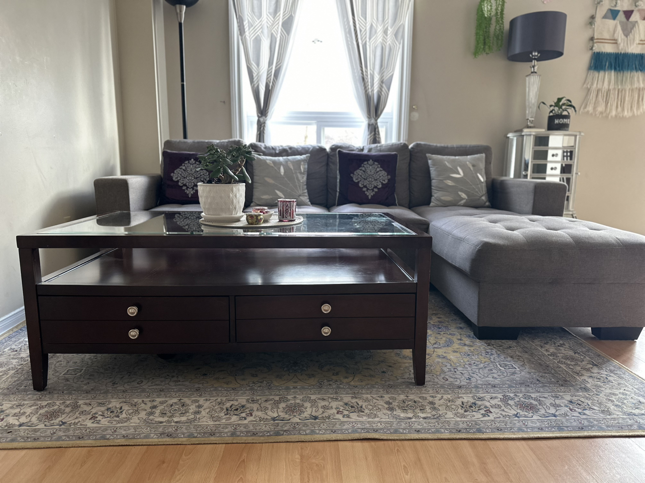 28Glass top wooden coffee table. Two broad Drawers open on one side. No scratch & Sturdy table. Coffee table measures 48" long, 28" wide, and 19" high. Price Coffee Table-$140 3 +2 Seater sofa for sale. Bought 1.5 years back now moving out that’s y selling it out. No rip (Perfect condition),Pets free,Smoke free. Price Sofa-$425