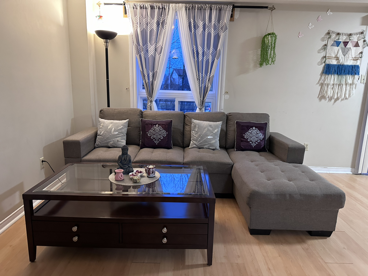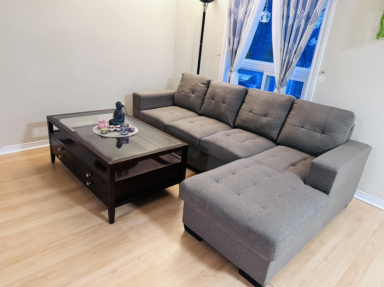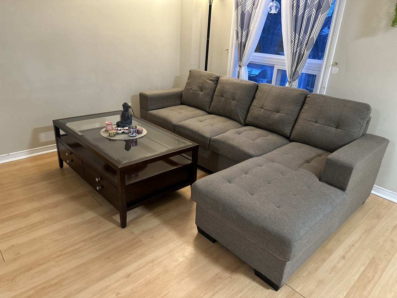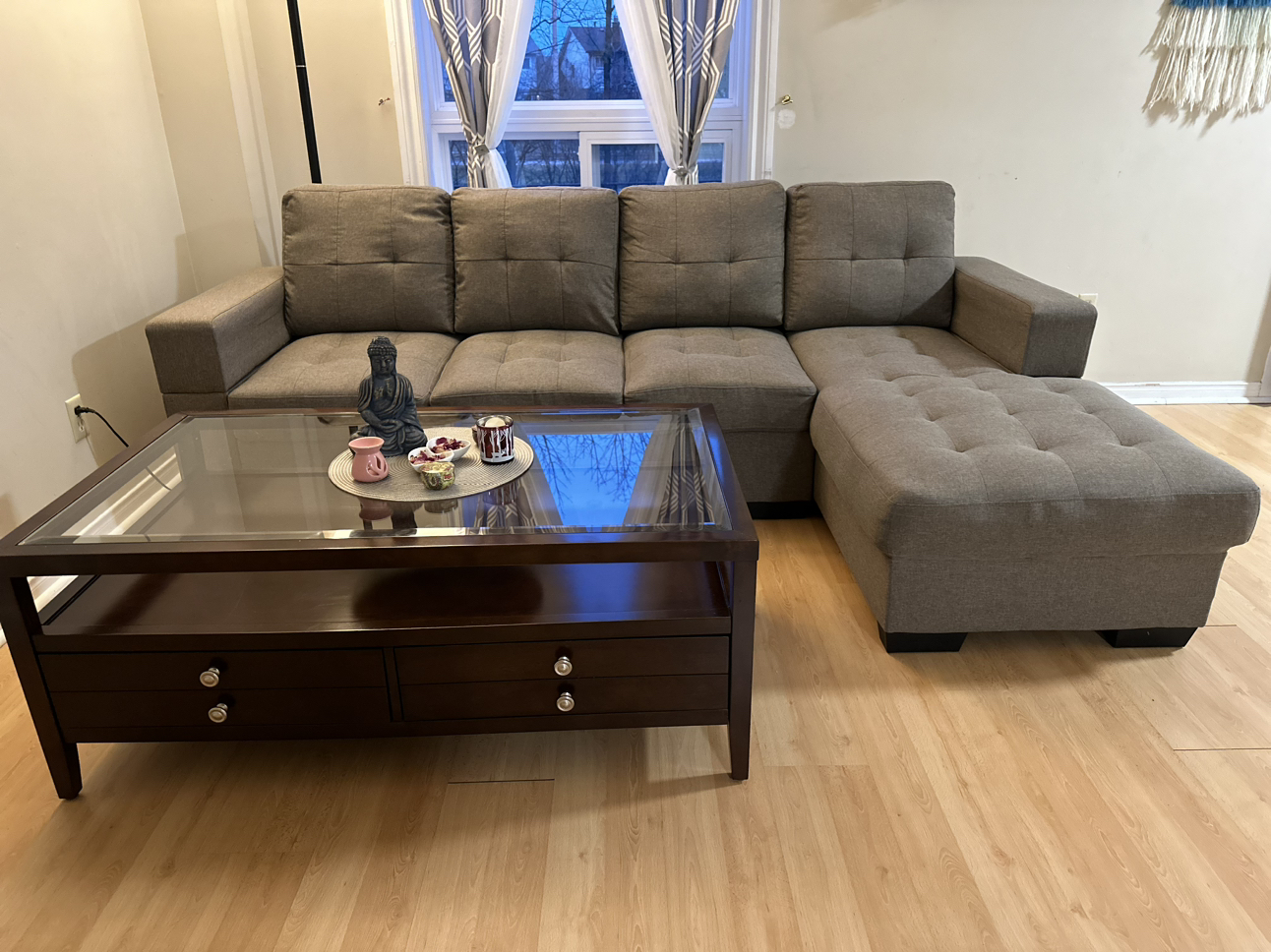 28Glass top wooden coffee table. Two broad Drawers open on one side. No scratch & Sturdy table. Coffee table measures 48" long, 28" wide, and 19" high. Price Coffee Table-$140 3 +2 Seater sofa for sale. Bought 1.5 years back now moving out that’s y selling it out. No rip (Perfect condition),Pets free,Smoke free. Price Sofa-$425