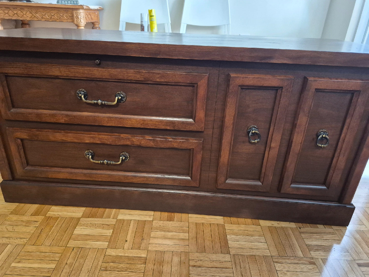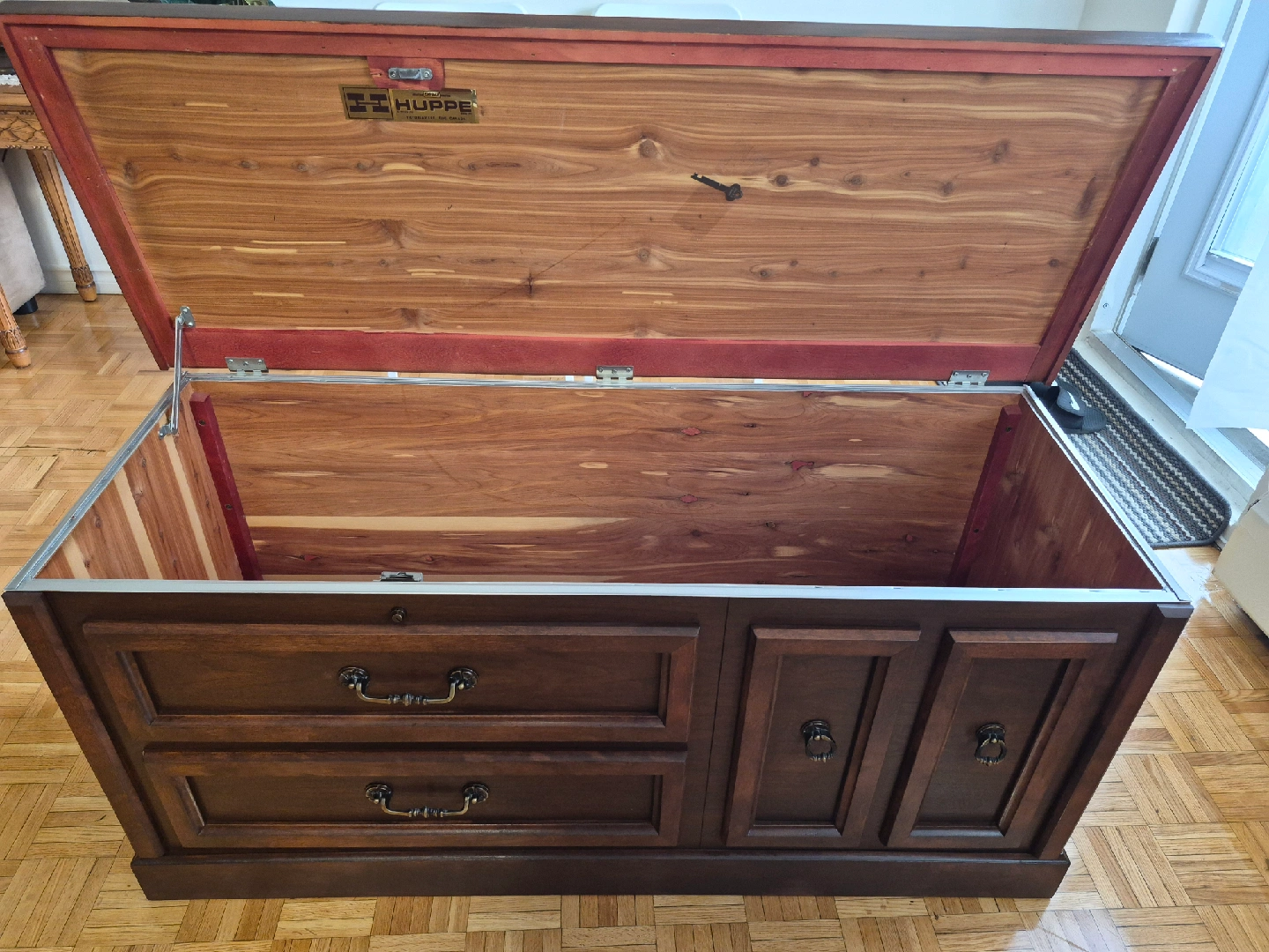Selling a beautiful Coffee table/Entertainment Unit. it opens up into a cedar chest in a rich brown wood finish. It's a great piece for storing blankets, linens, or other items while keeping them fresh with the natural cedar lining.