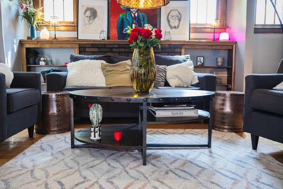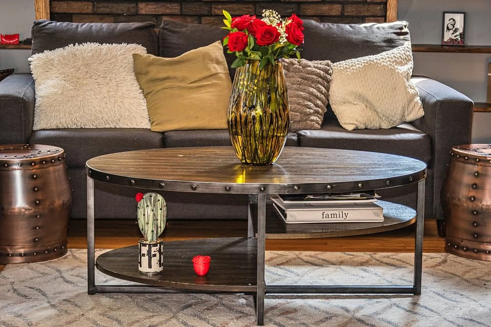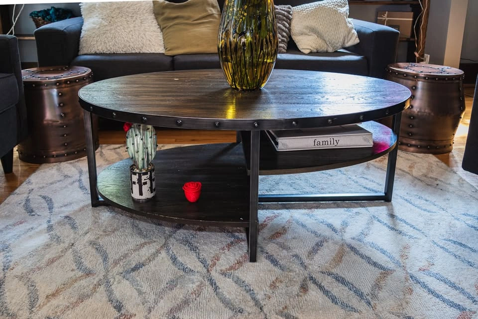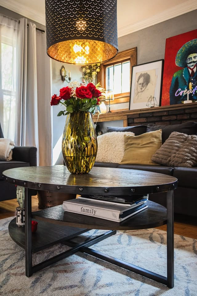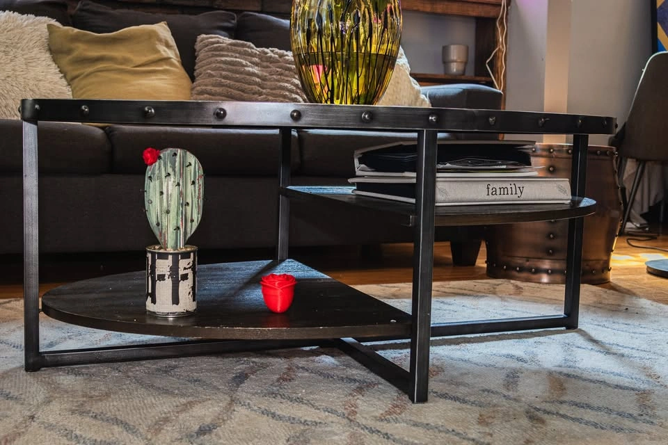 This medieval style coffee table made in metal and wood is the perfect item for a living room with character. It's oval shape makes it unique and functional. It has different levels to store your board games, albums or add the special decoration you love. Size: 0.75 x 1.20 m h= 48cm