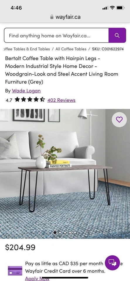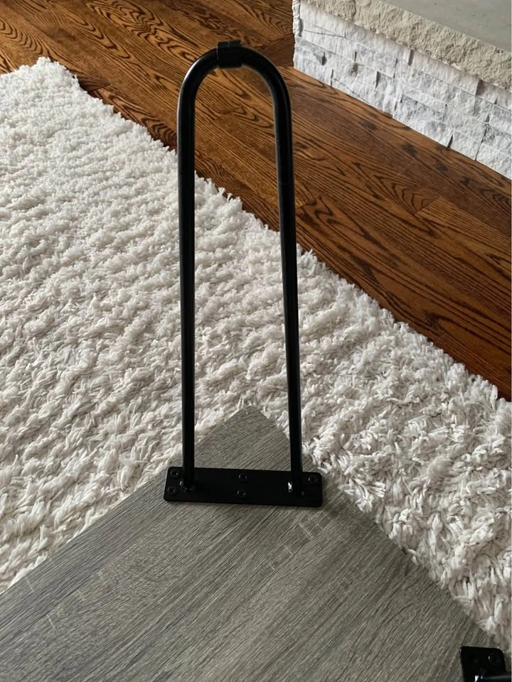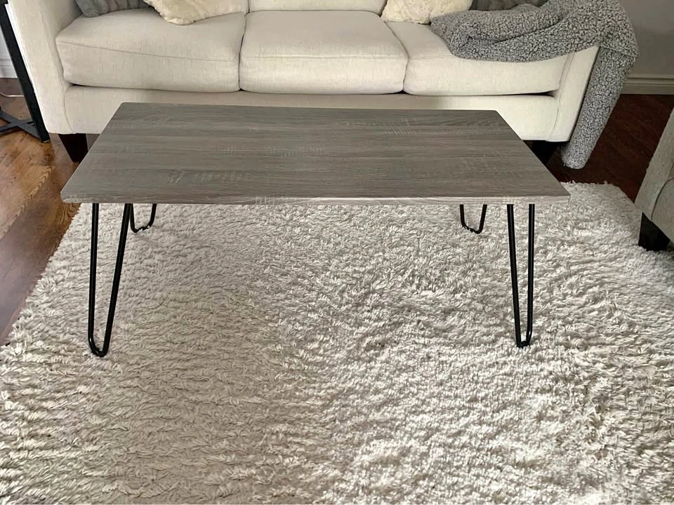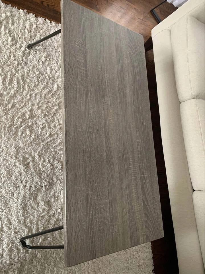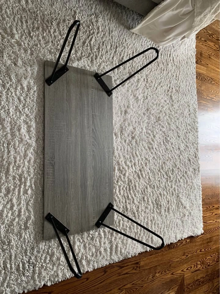 Wayfair Bertolt coffee table with hairpin legs. Gray too with black legs. One more or hear mark as shown in pic. Wood grain look with steel accent. Cash only on pickup in the Rathburn and Tomken area Mississauga.