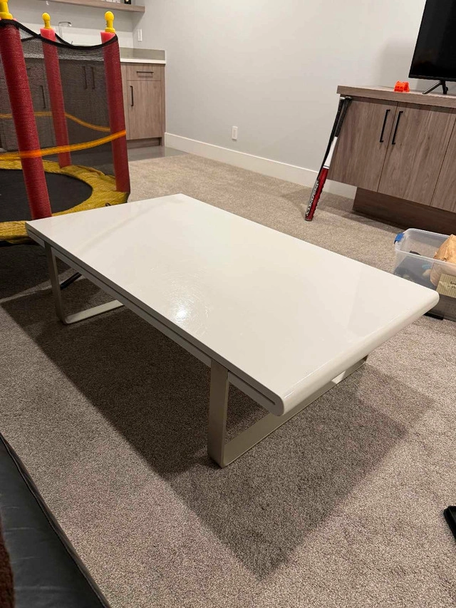 Large coffee table in glossy white with brushed metal legs. Heavy and stable with a wide, low-profile — perfect centerpiece for any modern living room. Dimensions: 55" L × 31.5" W × 17.5" H (139.7 × 80.0 × 44.5 cm) Glossy finish, easy to clean Durable designer-style build Comparable modern coffee tables retail for $400+. Asking $200. Calgary pick-up only.