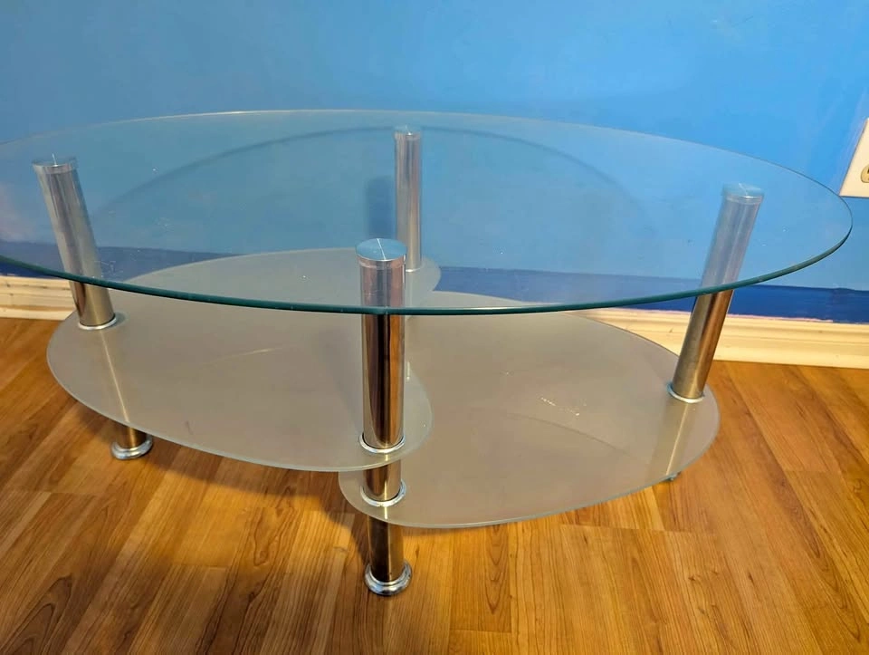 10Coffee Table with Glass Top - Chrome | White Includes Coffee Table with Bottom Shelves Features Top Glass Clear and Bottom Frosted White or Glossy Black with Chrome Legs Model- CT-01-IN Coffee Table: 36"L x 22"W x 17"H Colour- Chrome | White | Black Material- Glass & Chrome | *6 mm Tempered Glass