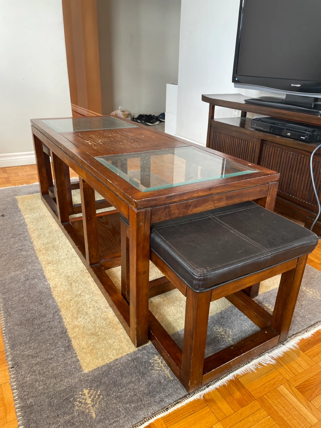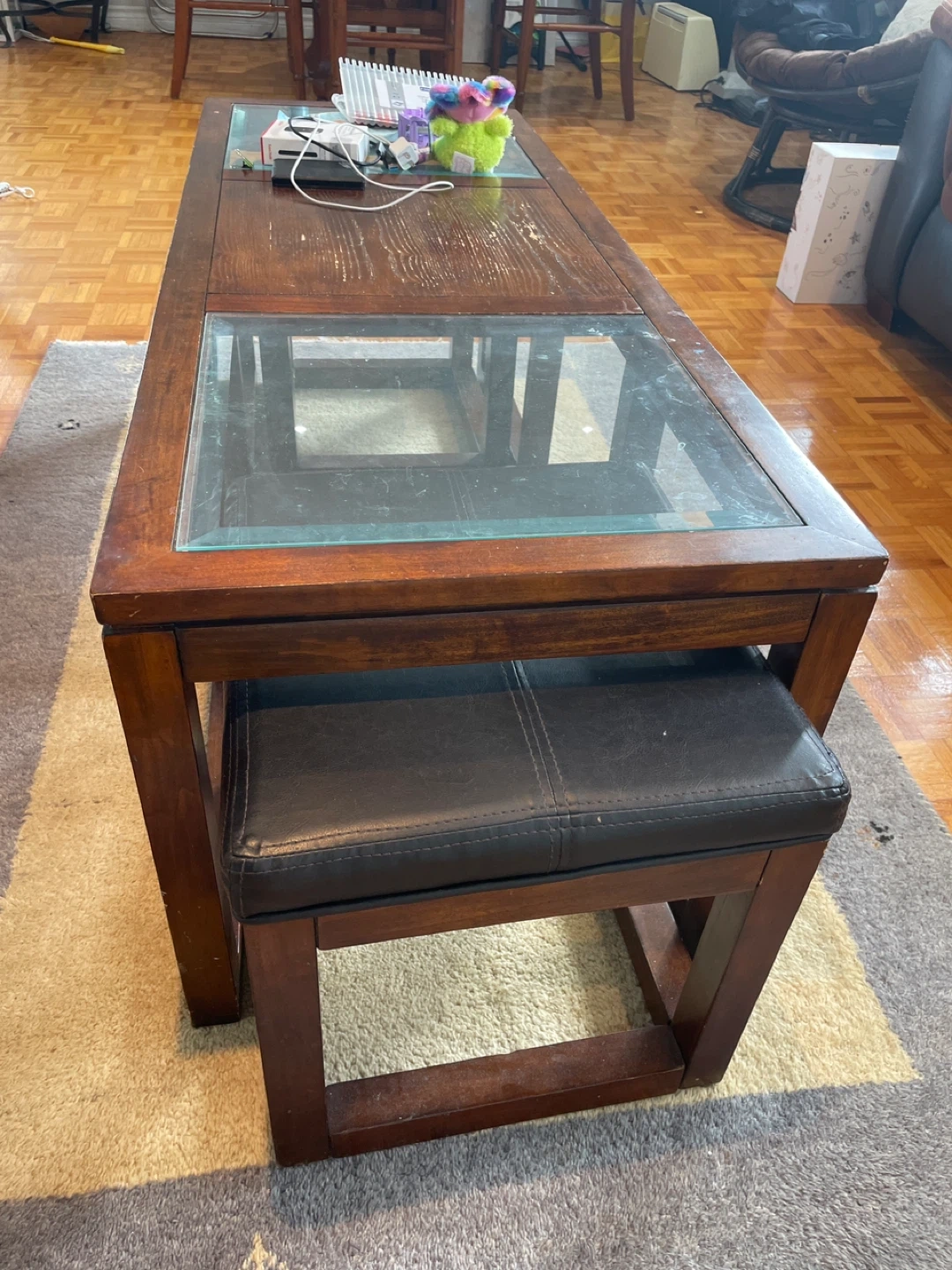 65Coffee table with glass top and two nesting ottomans. The table is made of wood and has a dark finish. The ottomans are upholstered in a dark material. It's a great set for a living room or family room!