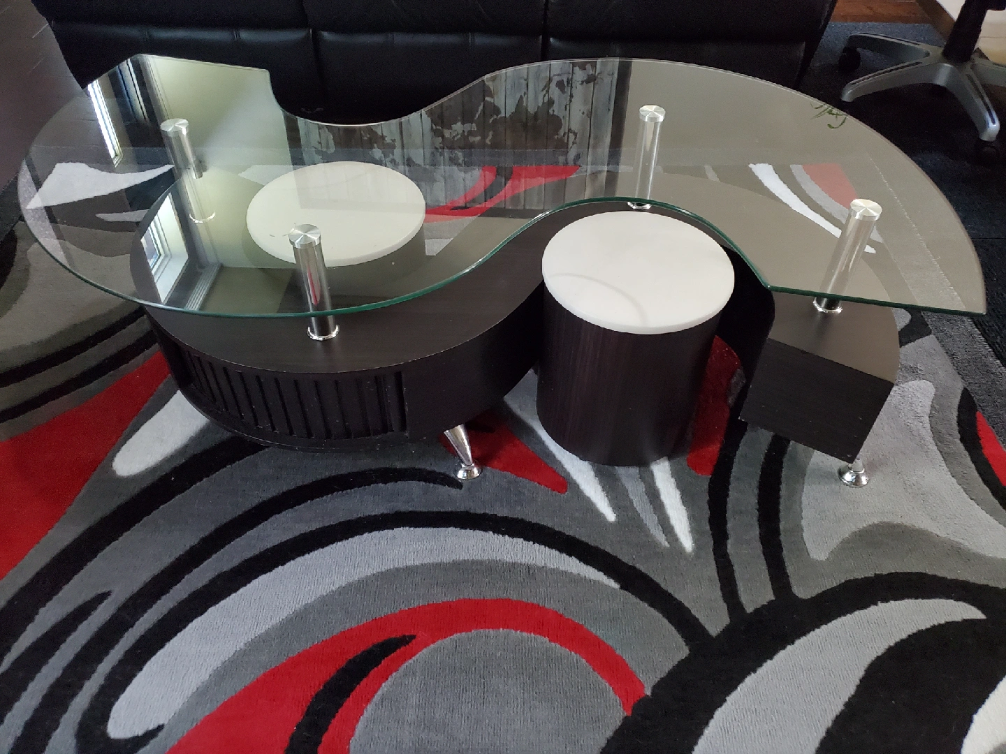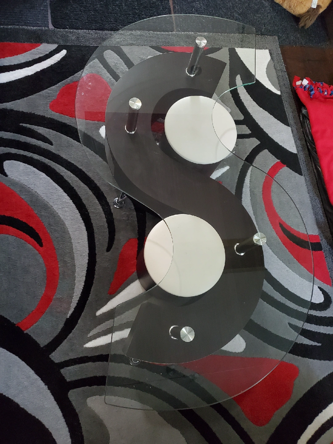 Looking to add a unique piece to your living room? This Yin Yang shaped coffee table is sure to be a conversation starter! It features a glass top and a dark wood base with white circular accents. It's in great condition and ready for a new home!