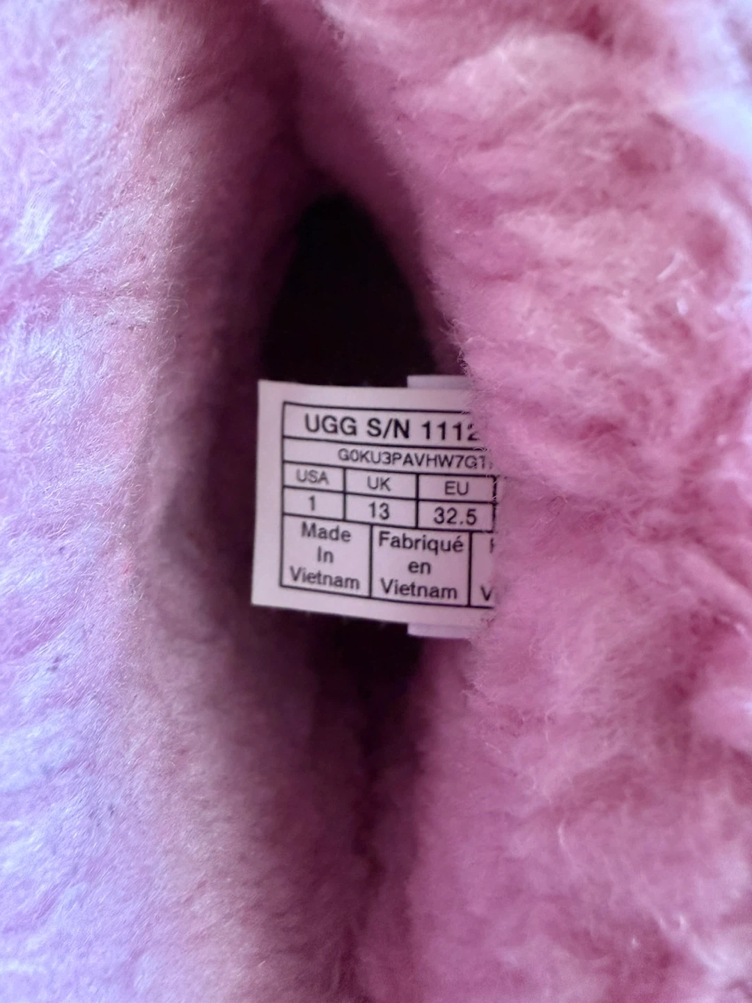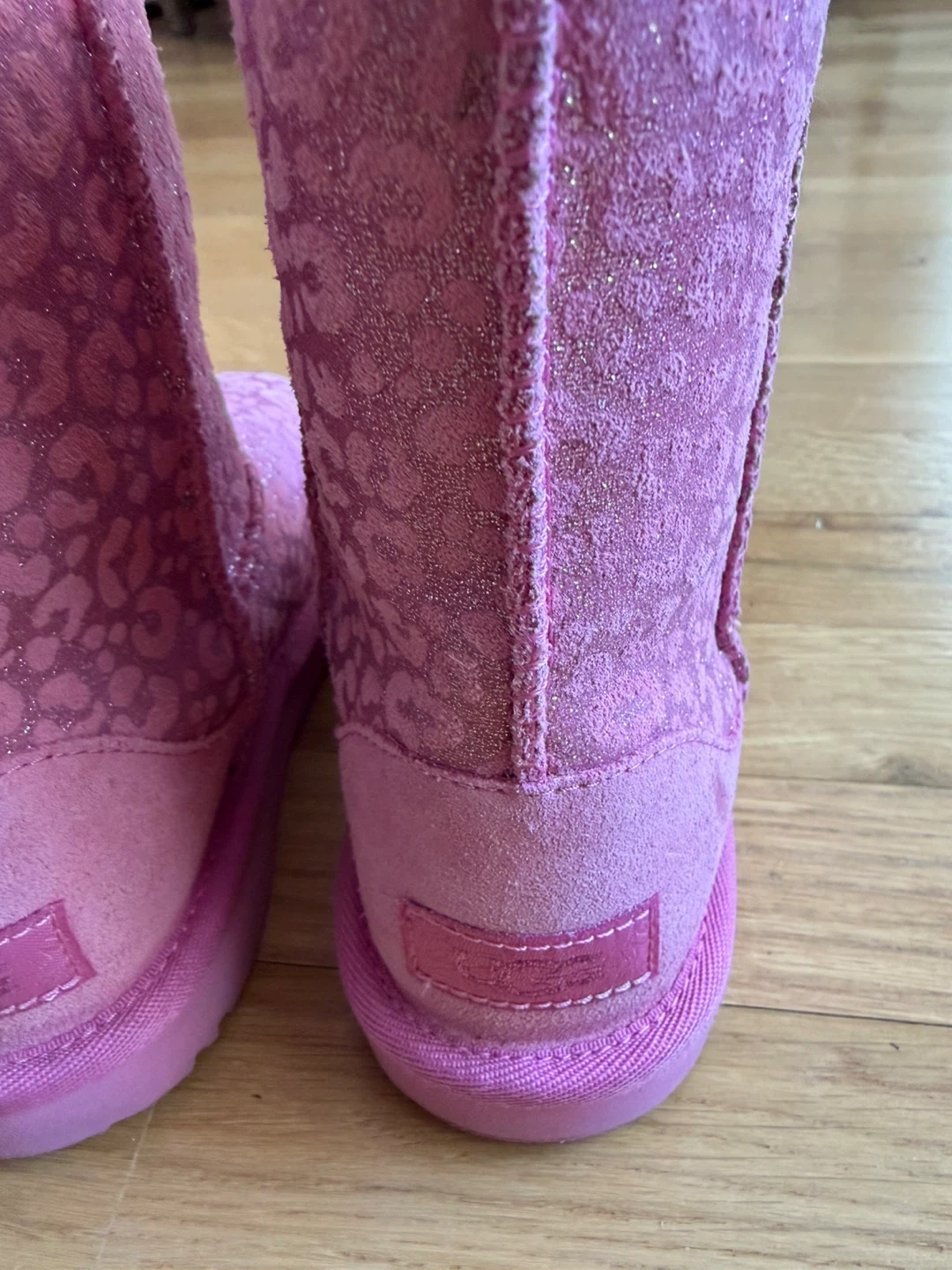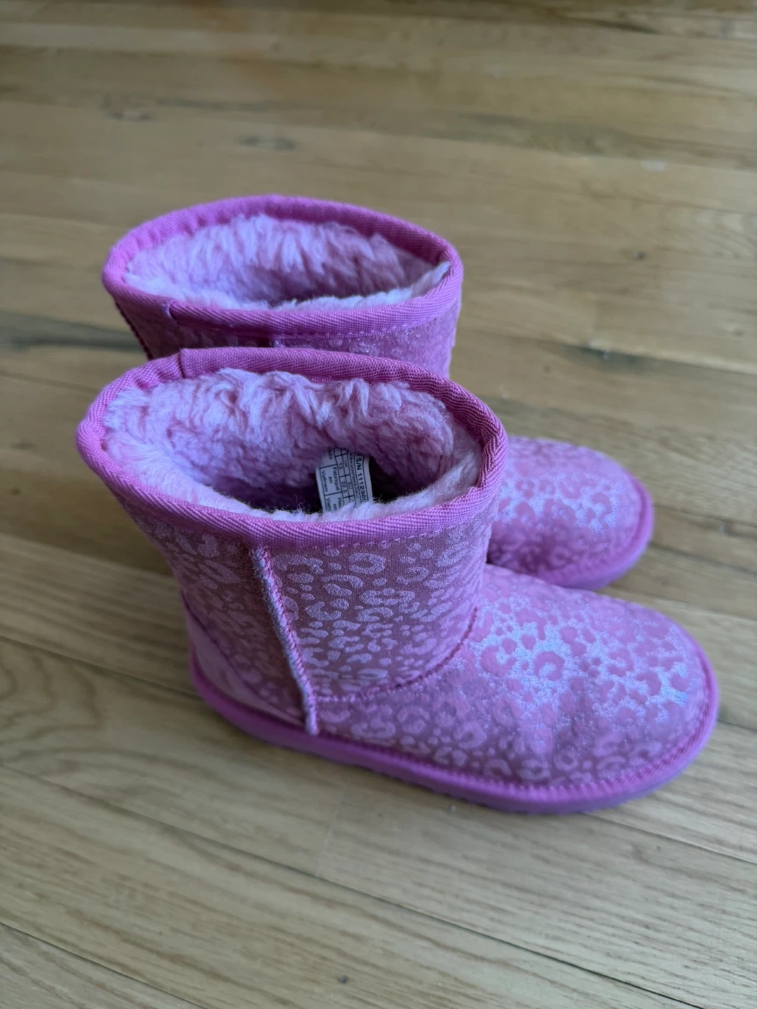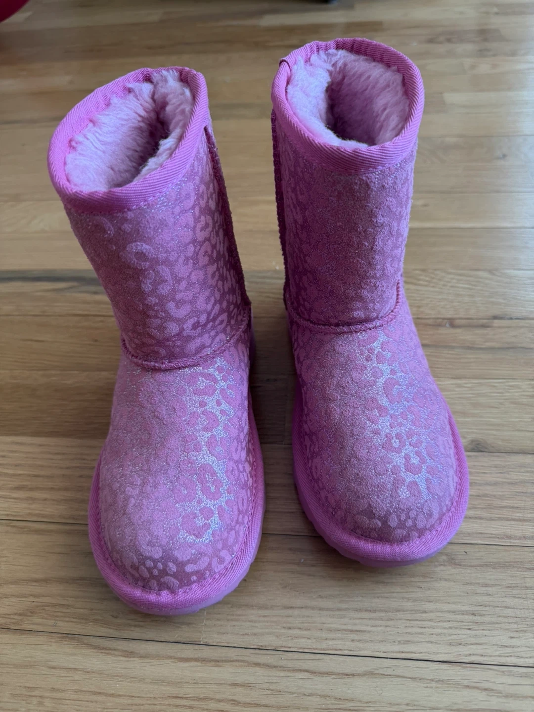These are Ugg Classic Short boots in a fun pink leopard glitter design. They're perfect for keeping little feet cozy and stylish. Big kids size 1.