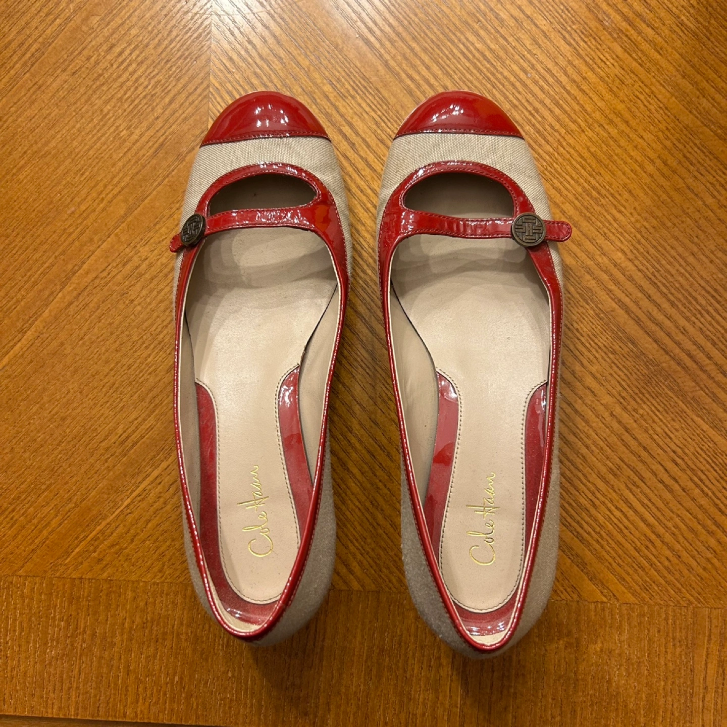10Wedge heels with red patent leather toe and heel. Tan fabric upper. Nike air sole. Worn fewer than 5 times.