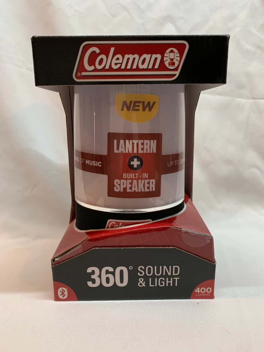 109Selling a brand new Coleman 360° Sound & Light lantern! It's still in its original packaging. - Provides 360° of light (400 lumens) and has a built-in wireless speaker ( for up to 20 hours of play) with Bluetooth technology - Battery is easily rechargeable through USB charging - Weather resistant - Includes 1 rechargeable lantern & USB charging cord
