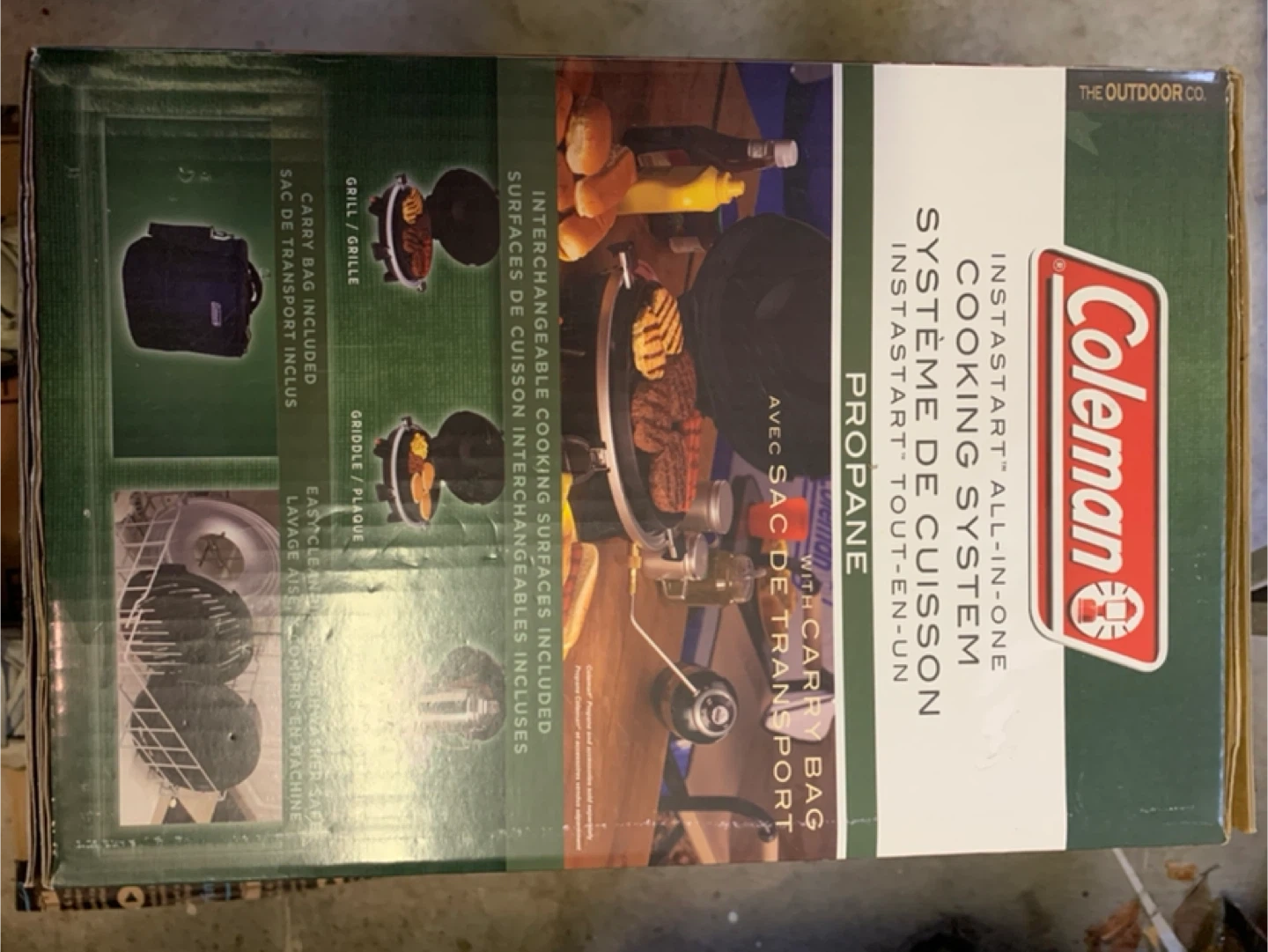 101Selling a Coleman All-In-One Cooking System! It features interchangeable cooking surfaces and comes with a carry bag for easy transport. Perfect for camping or backyard BBQs! Easy to set up and clean, this portable cooking system is ready for your next adventure. Brand new in the box. Compatible retail is $149.99 at CTC