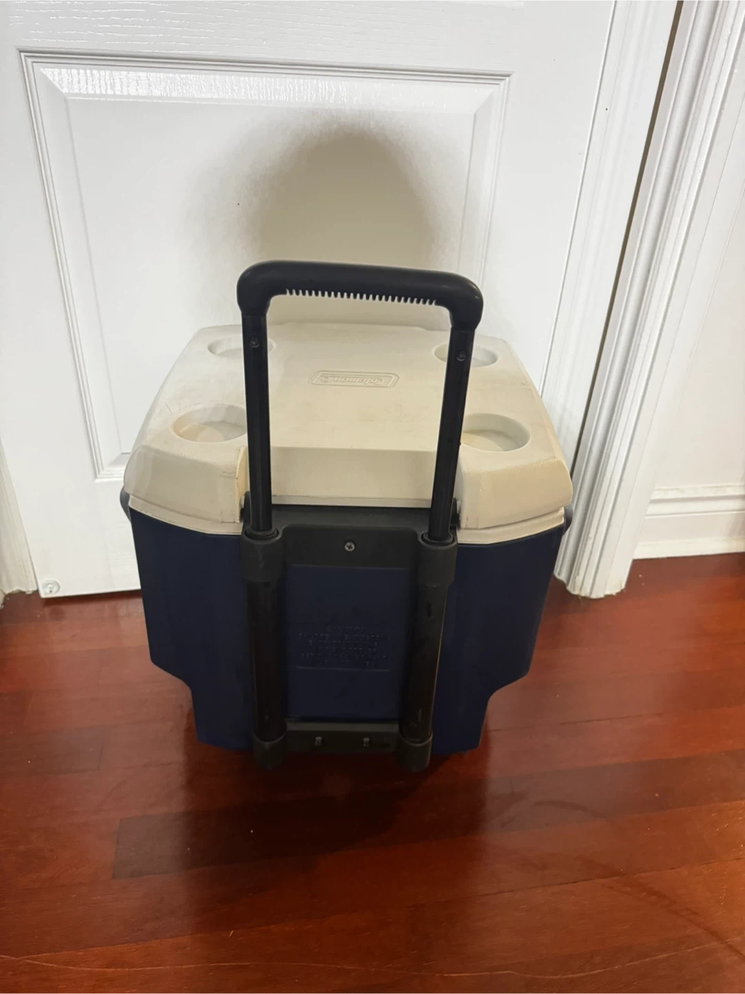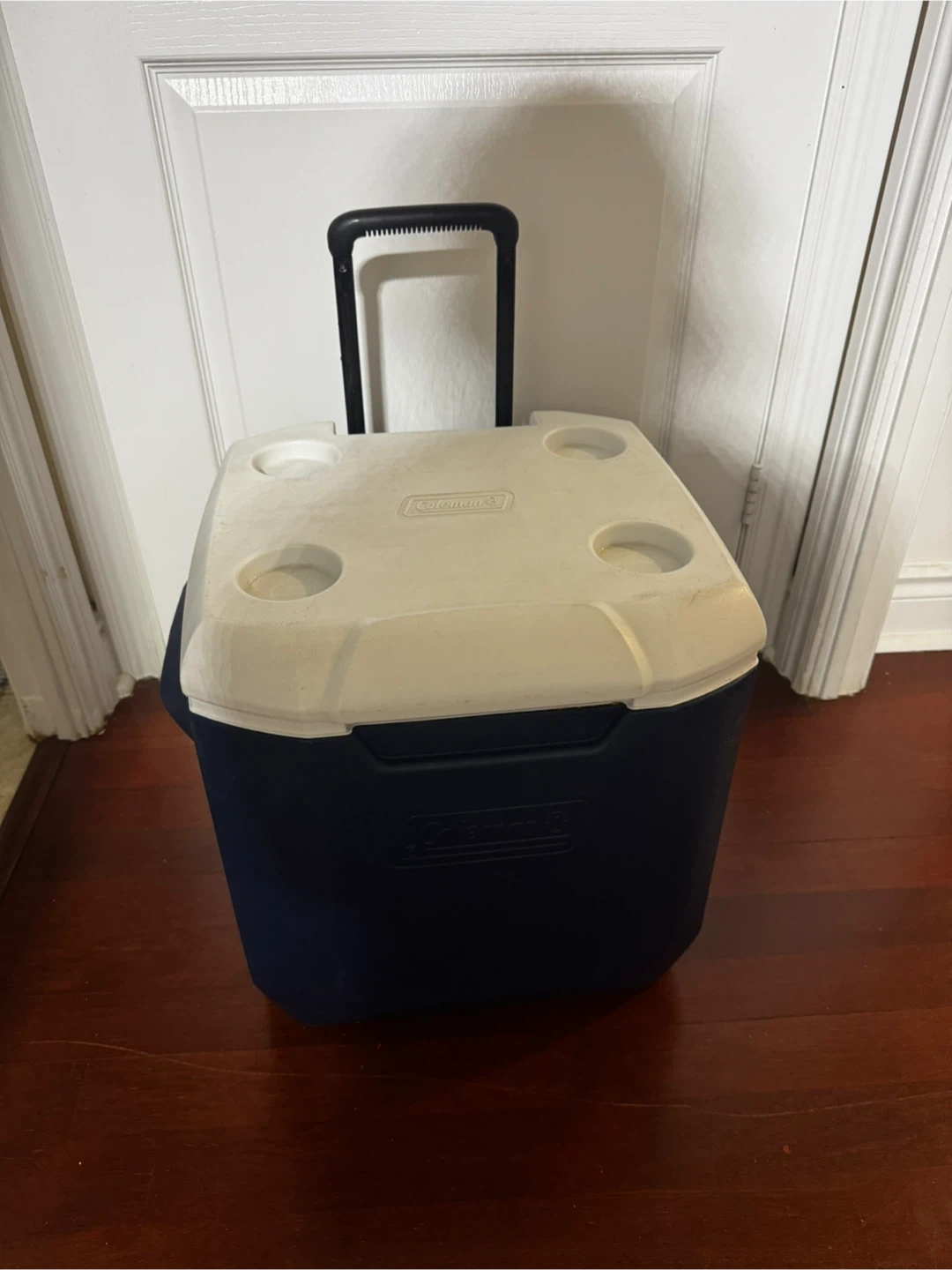 Selling a Coleman rolling cooler! It's in like new condition and ready to keep your drinks and snacks cold on the go. It features a convenient handle and wheels for easy transport, plus molded cup holders on top 18x14 H 16 inches $45 Yonge and finch area
