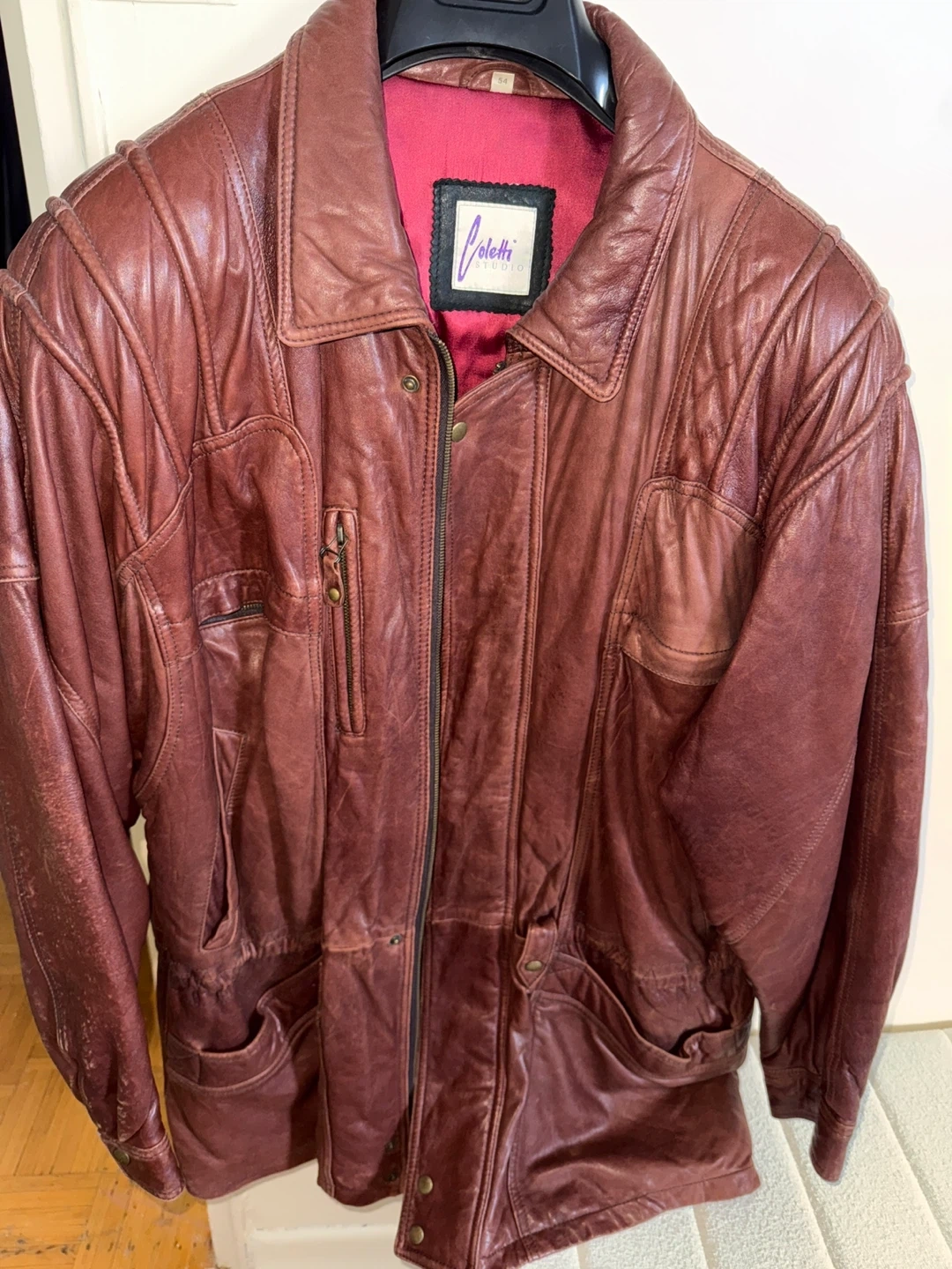91Work but still in good condition inside and out! Here's a stylish Coletti Studio leather jacket in a rich burgundy colour! The tag indicates it's a size L (GB 54). It's made of genuine leather (Echtleder/Cuir/Cuero). A great addition to any wardrobe!