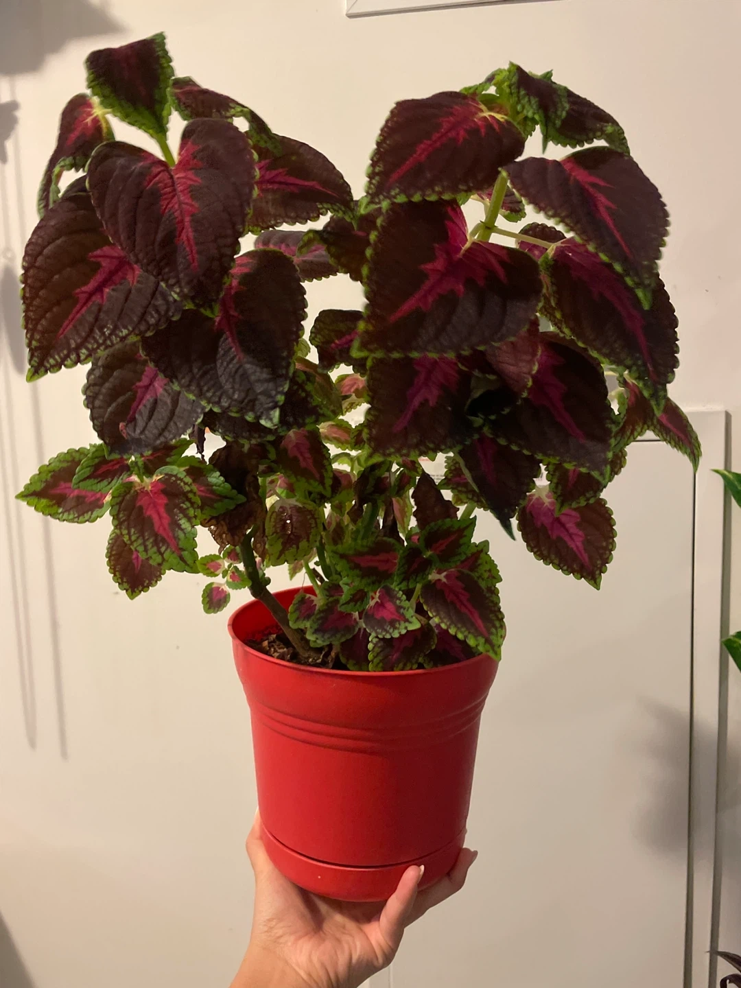 85A vibrant coleus plant in a bright red pot is looking for a new home! This plant features striking leaves with a mix of deep burgundy, red, and green, adding a splash of colour to any space.