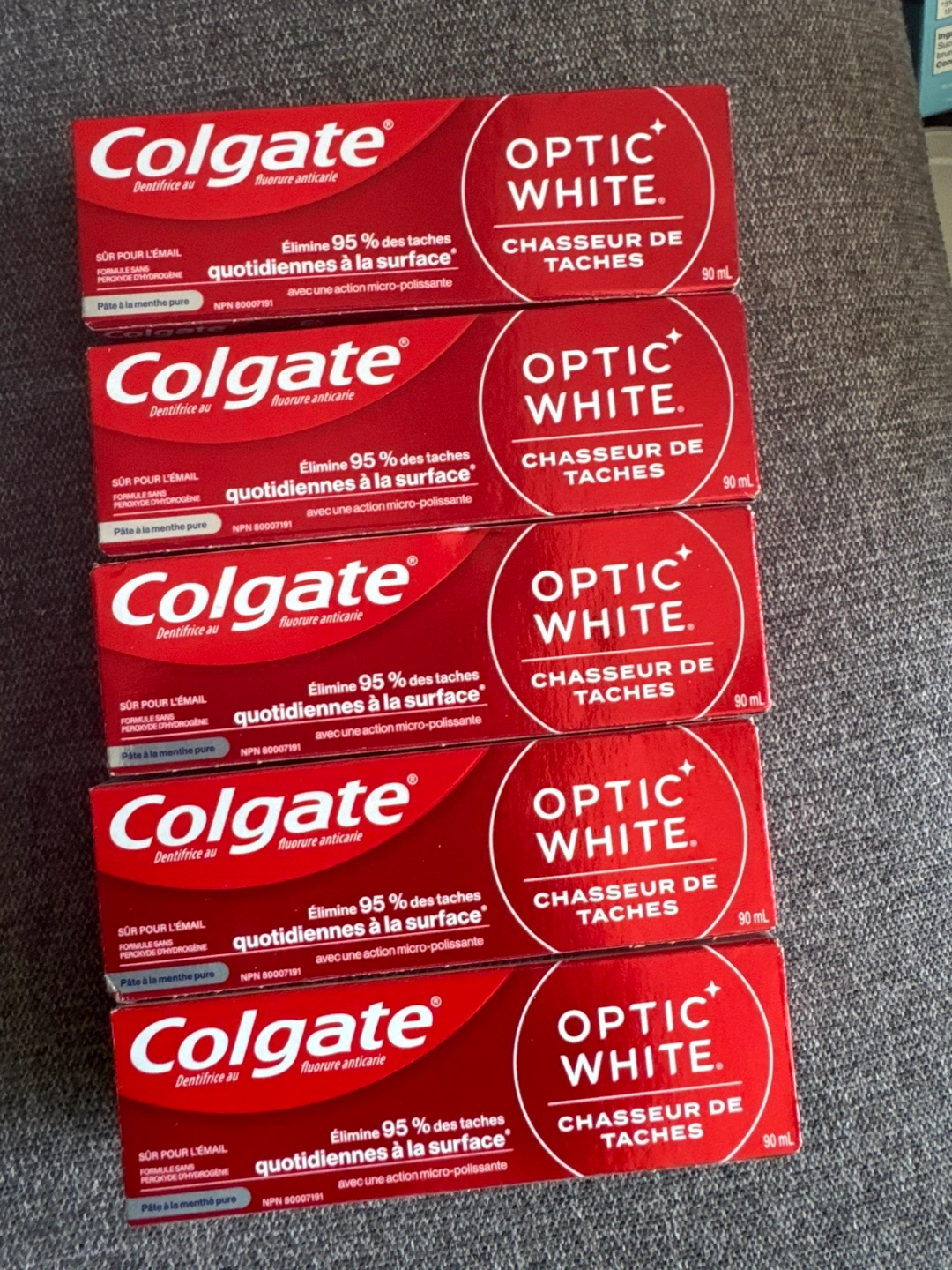 Selling five tubes of Colgate Optic White toothpaste. Each tube contains 90 mL of toothpaste. This toothpaste eliminates 95% of daily surface stains and contains fluoride for anti-cavity protection