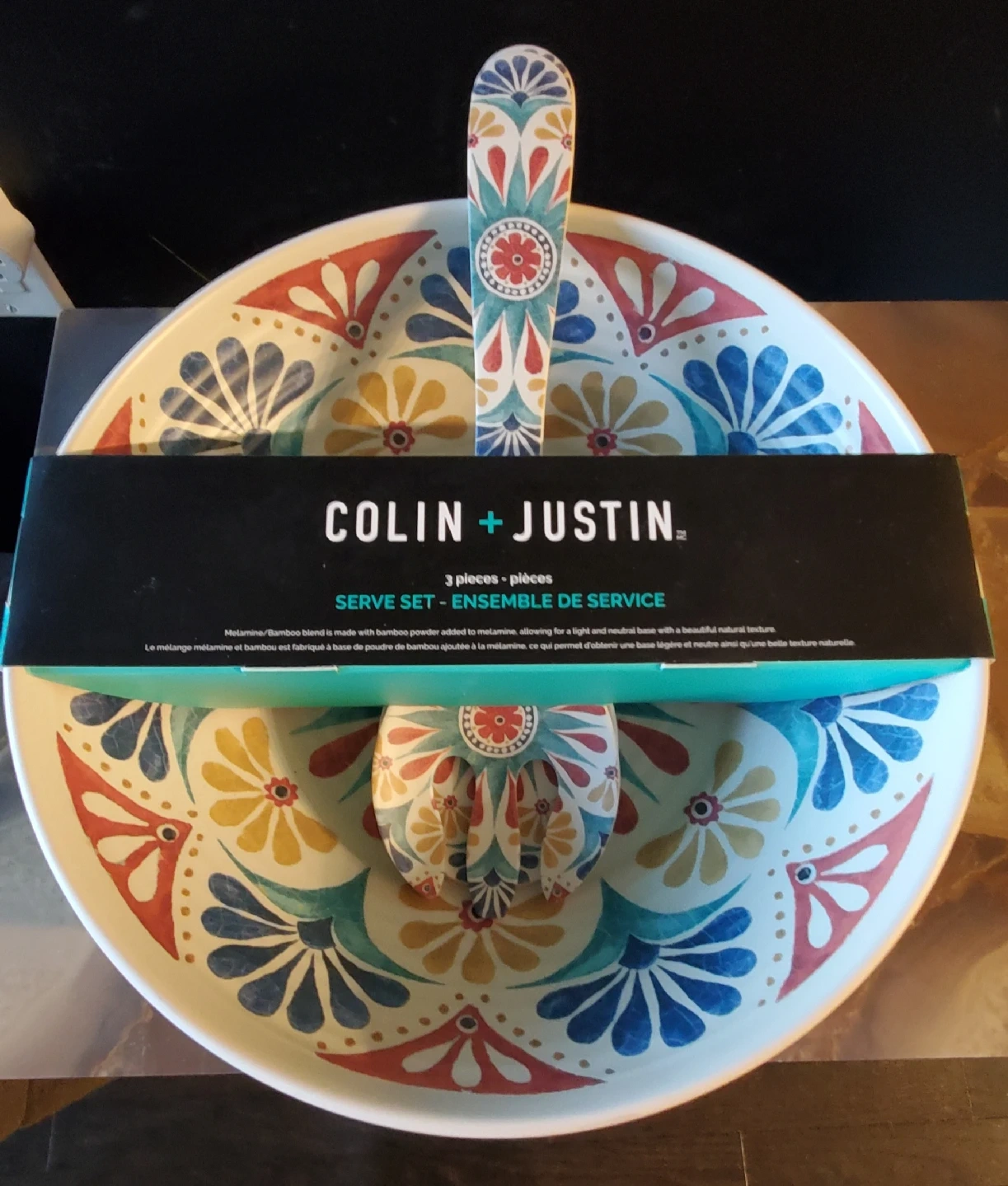 919New. Selling a Colin + Justin serve set! This 3-piece set, Salad bowl and Serving utensils. Melamine/bamboo blend. It's lightweight.