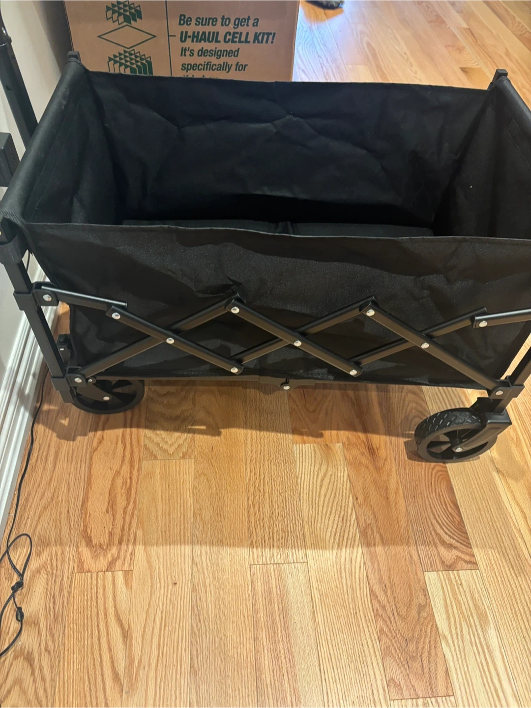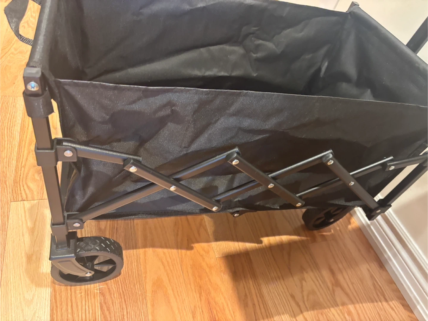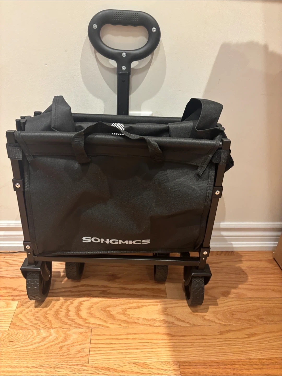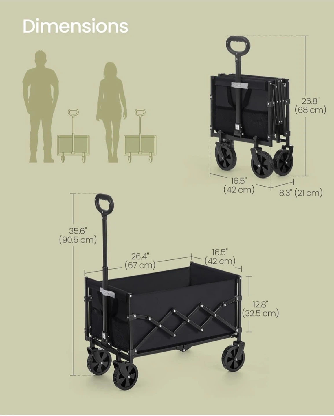 202This black collapsible folding wagon cart by SONGMICS is perfect for carrying groceries, gardening supplies, or anything else you need to haul around! It can hold up to 400 lbs. The dimensions are 35.6" (90.5 cm) tall, 26.4" (67 cm) wide, and 12.8" (32.5 cm) deep.