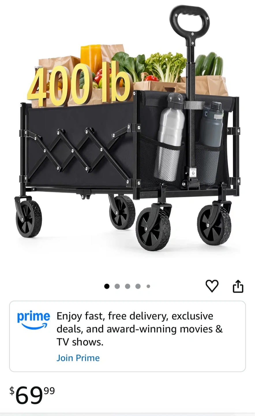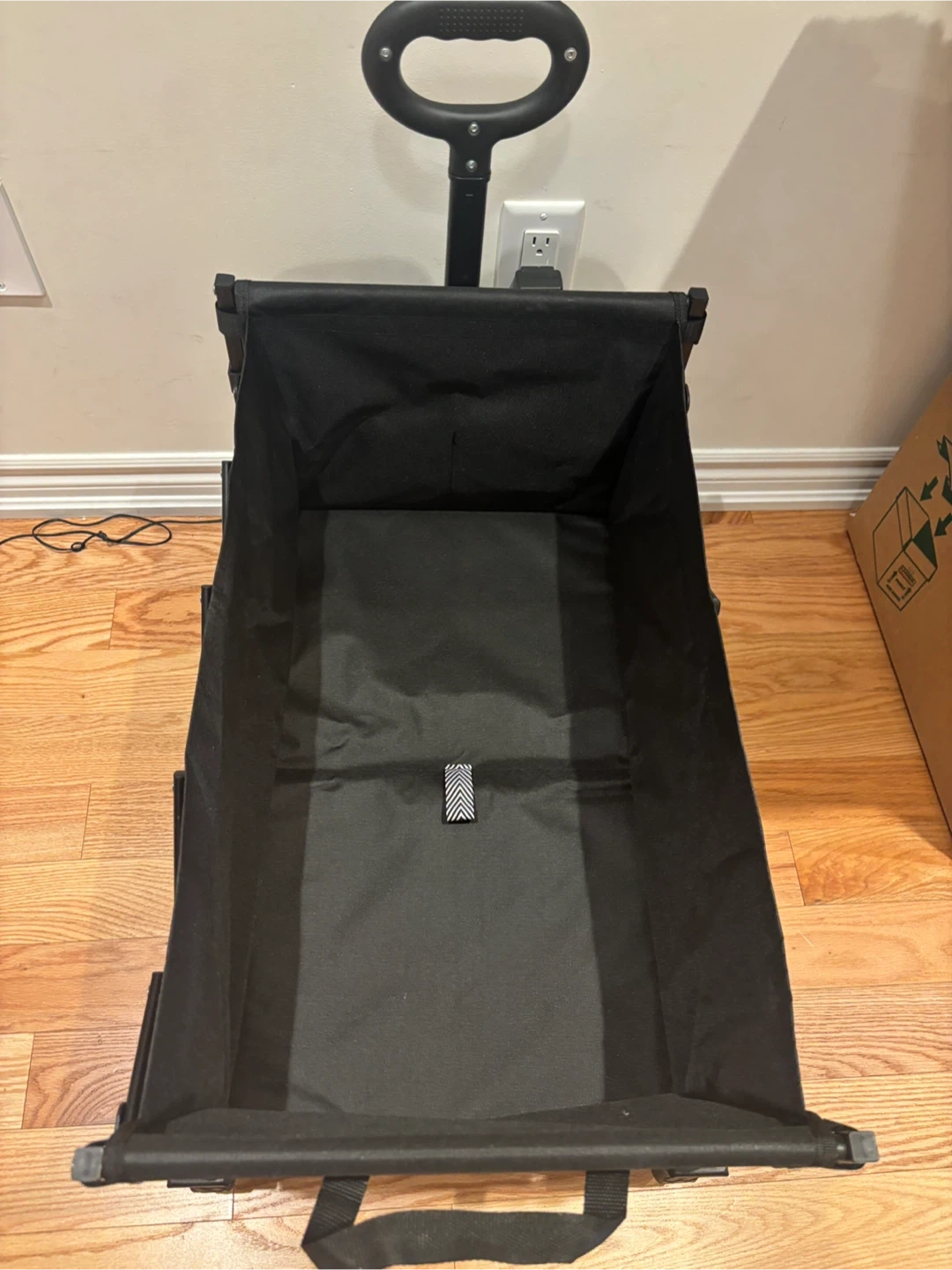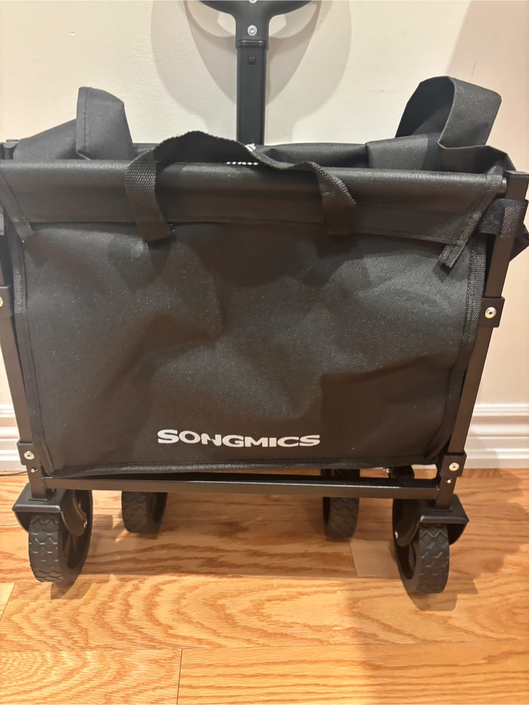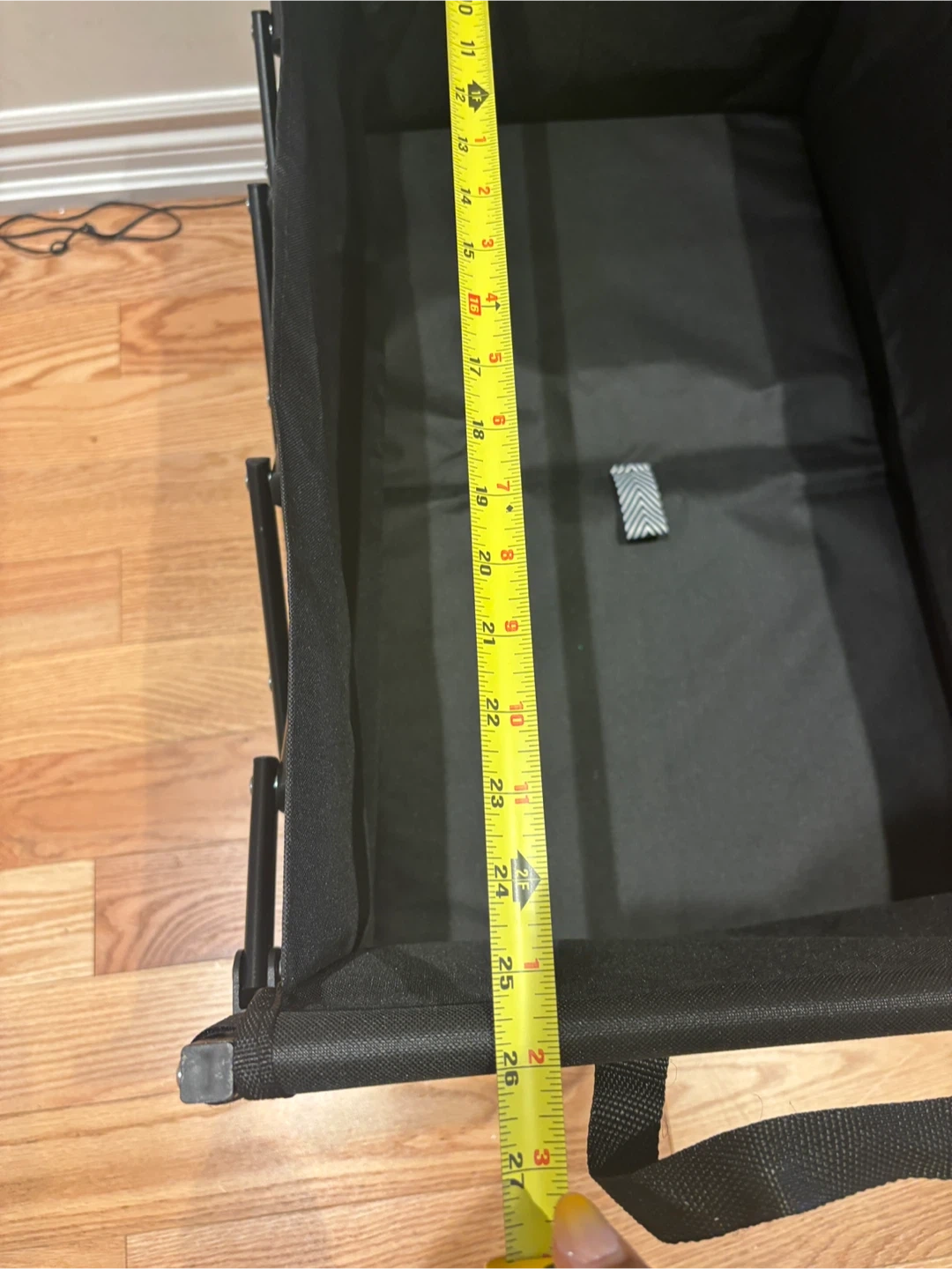 202This black collapsible folding wagon cart by SONGMICS is perfect for carrying groceries, gardening supplies, or anything else you need to haul around! It can hold up to 400 lbs. The dimensions are 35.6" (90.5 cm) tall, 26.4" (67 cm) wide, and 12.8" (32.5 cm) deep.