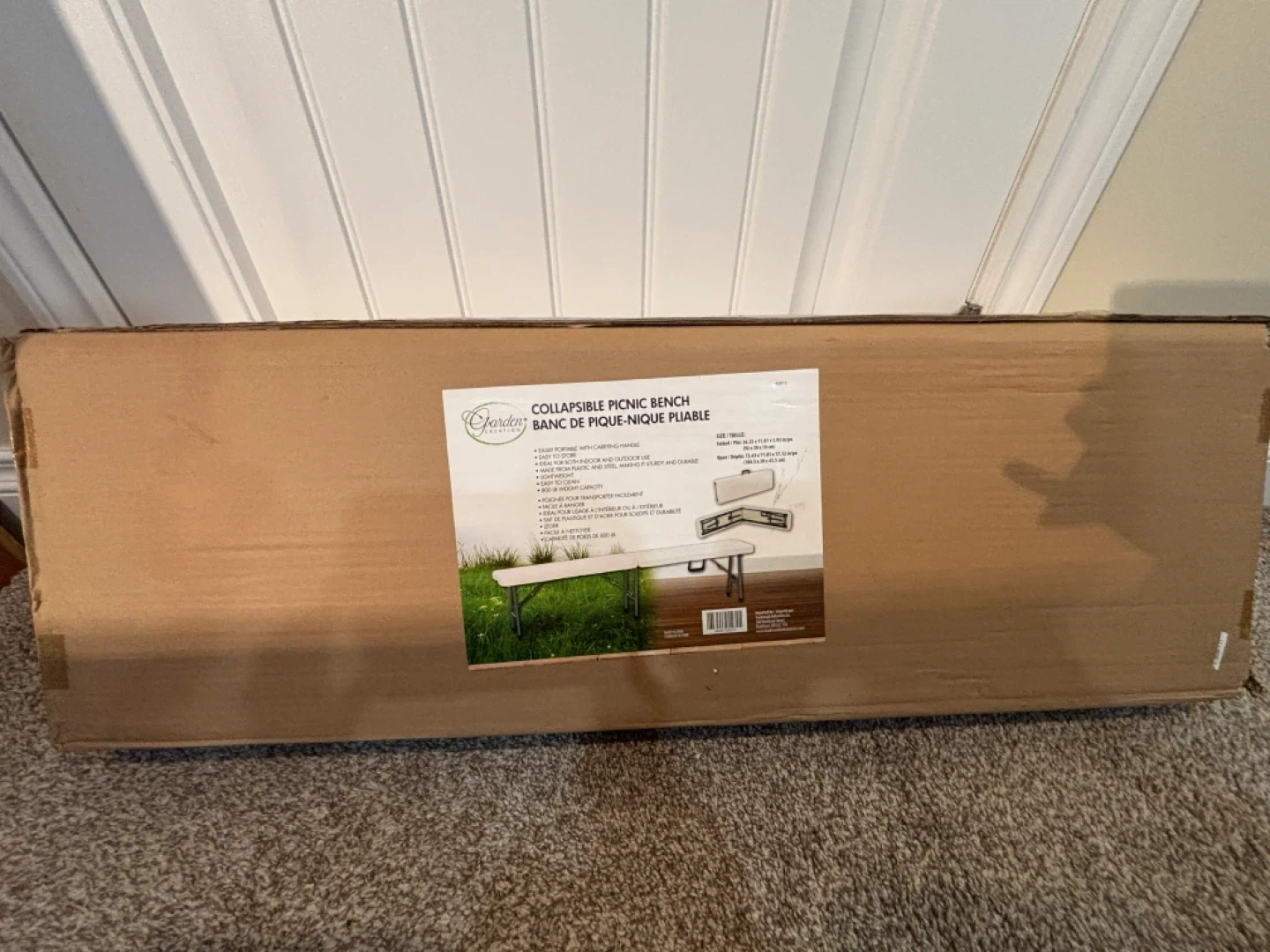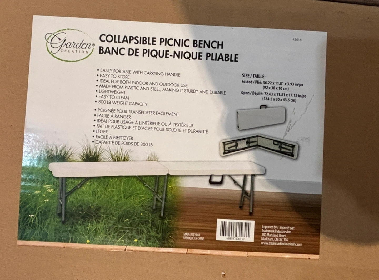 This Garden Creation collapsible picnic bench is brand new in the box! It's easily portable with a carrying handle and easy to store. Ideal for both indoor and outdoor use. Made from plastic and steel, making it sturdy and durable. It's lightweight and easy to clean. It has an 800 lb weight capacity. Size: Folded: 36.22 x 11.81 x 3.93 in Open: 72.63 x 11.81 x 17.12 in