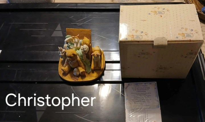 Selling a Cherished Teddies figurine named Christopher. It comes with its original box and certificate of adoption. A sweet addition to any collection!