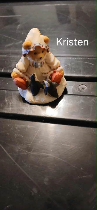This is a cute collectible bear figurine named Kristen. It features a bear wearing a white outfit with a hood and is surrounded by two penguins. It's a charming piece for any collector or as a decorative item!