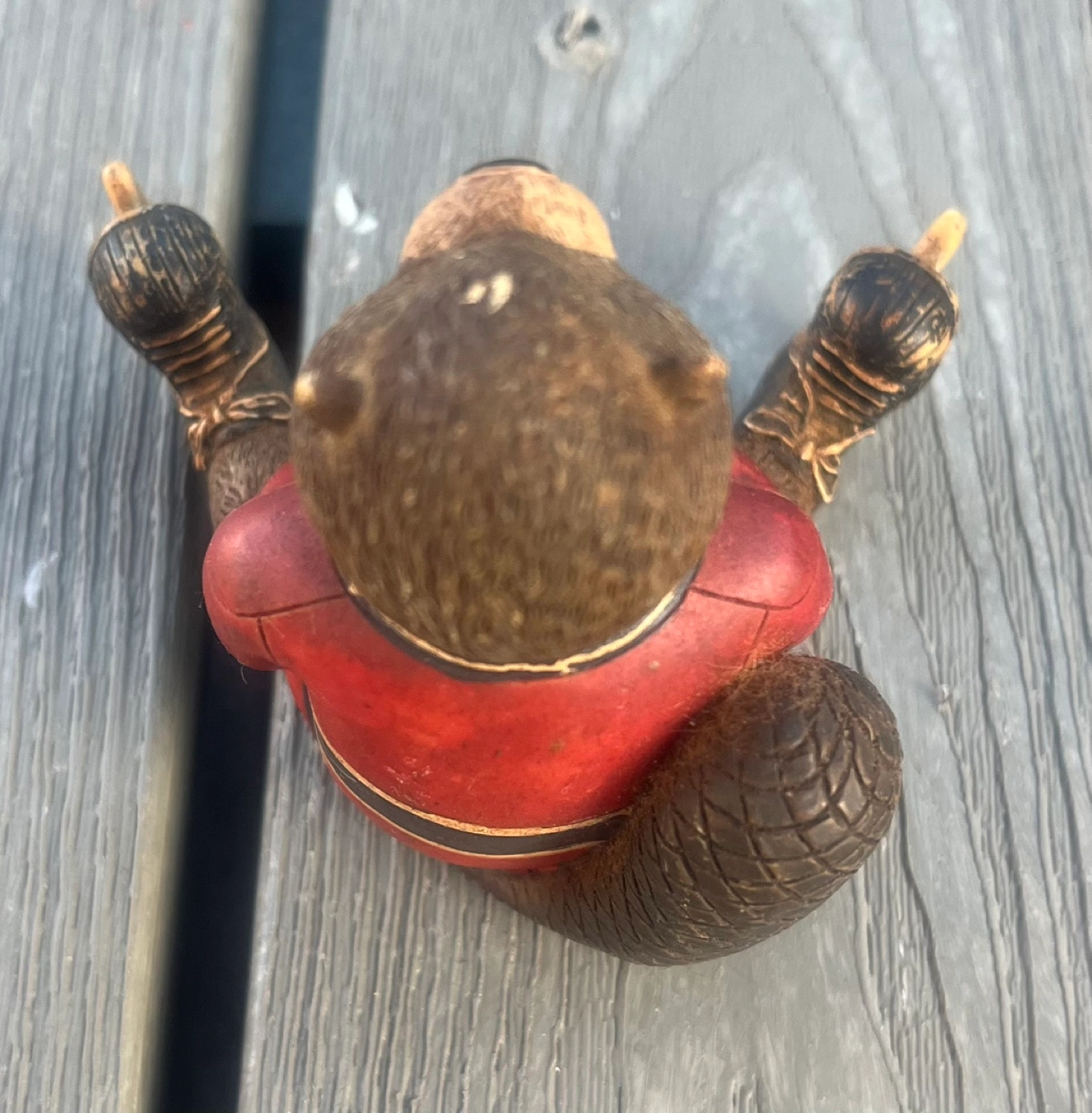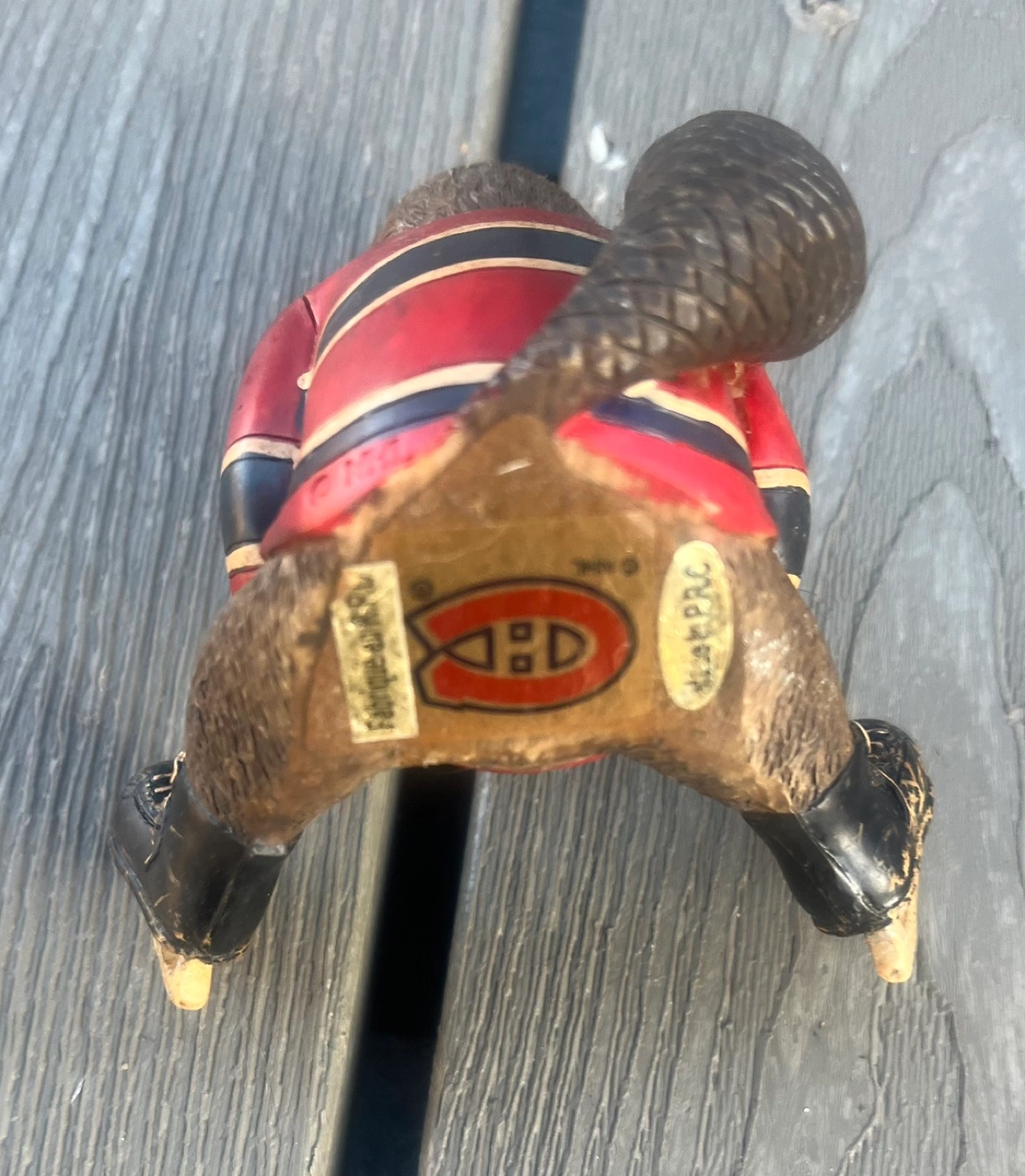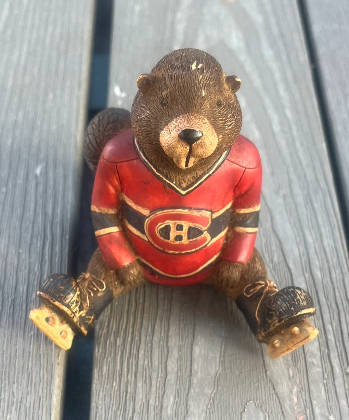 Cute resin beaver figurine wearing a Canadiens jersey. Small collectible item. Perfect for hockey fans.