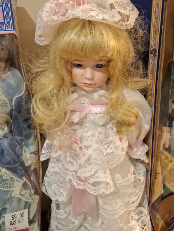Selling a beautiful porcelain doll, still in its original box! She has blonde hair and blue eyes, and is wearing a lovely white lace dress with pink accents. A collectible piece for doll enthusiasts!