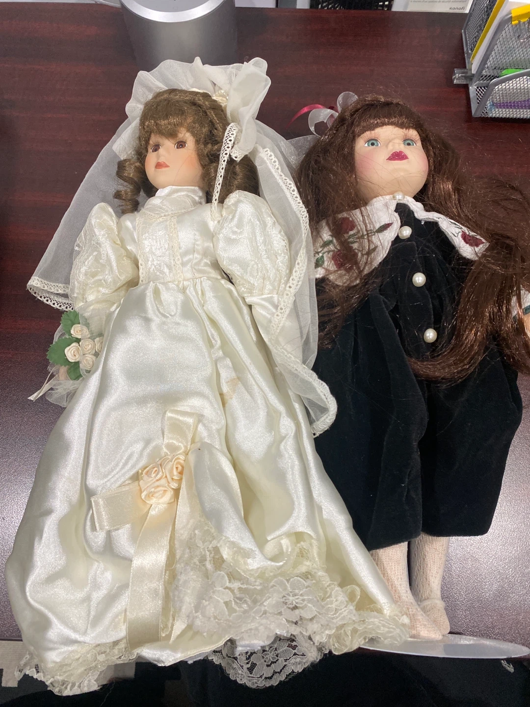 Two beautiful collectible porcelain dolls. One is dressed in a lovely white wedding gown with delicate lace detailing, and the other is in a charming dark green dress with pearl accents. Both dolls have long, flowing hair and are in great condition! . (shoes are missing from both of the dolls)
