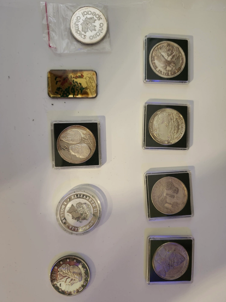 18Selling a collection of various silver coins. They are in protective cases and some are in original packaging. One coin is a 1981 coin with stars, another is a 'One Ounce Special Ontario' coin with a maple leaf, and another is a rectangular 'Merry Christmas' coin with Santa and a Christmas tree