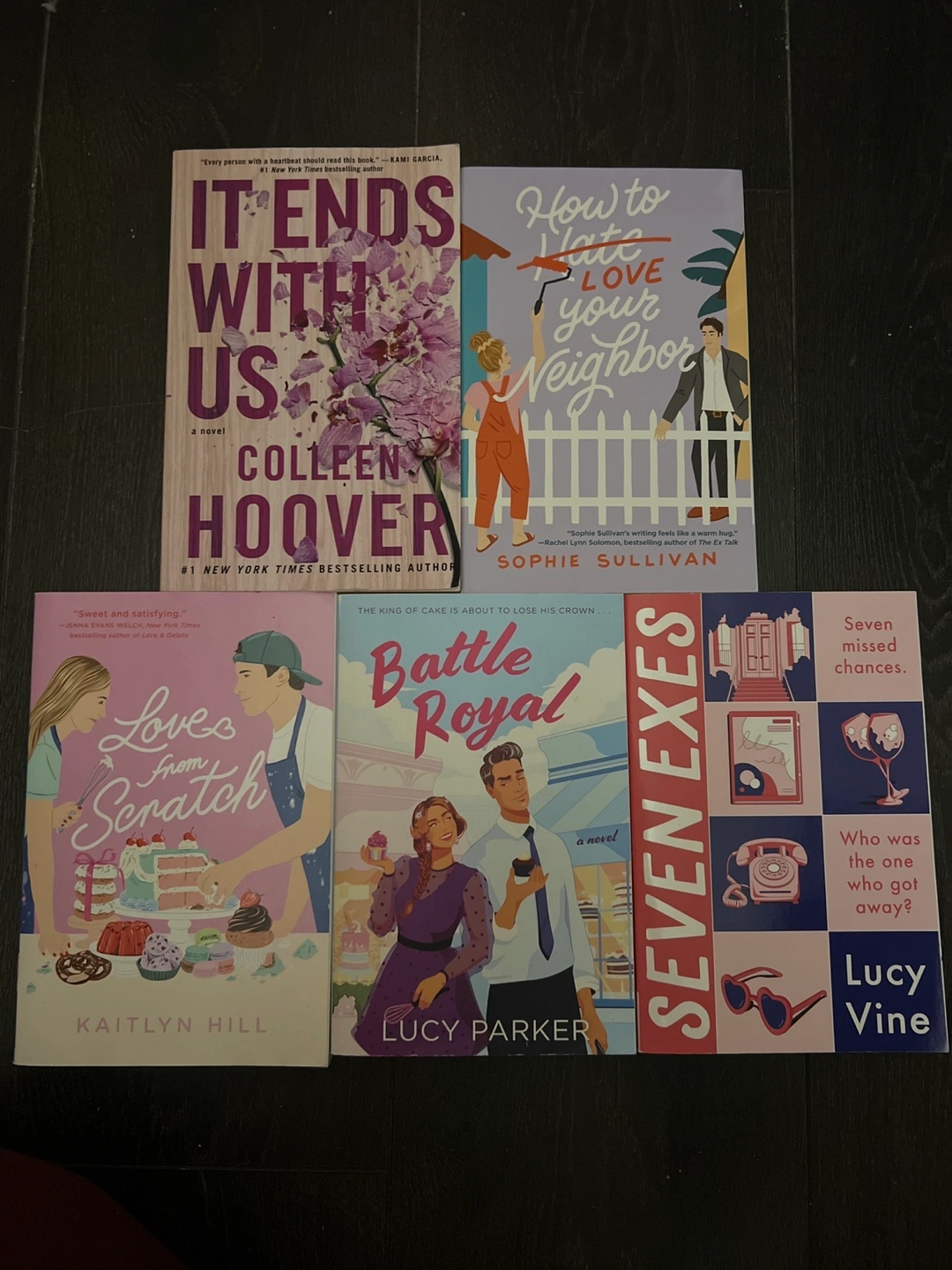 15Five romance novels by various authors. Includes Colleen Hoover's *It Ends With Us*, Sophie Sullivan's *How to Hate Love Your Neighbor*, Kaitlyn Hill's *Love From Scratch*, Lucy Parker's *Battle Royal*, and Lucy Vine's *Seven Exes*. Perfect for the romance reader. $10 each or 2 for $15