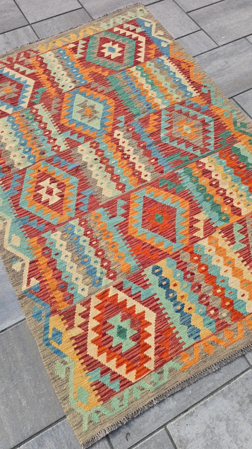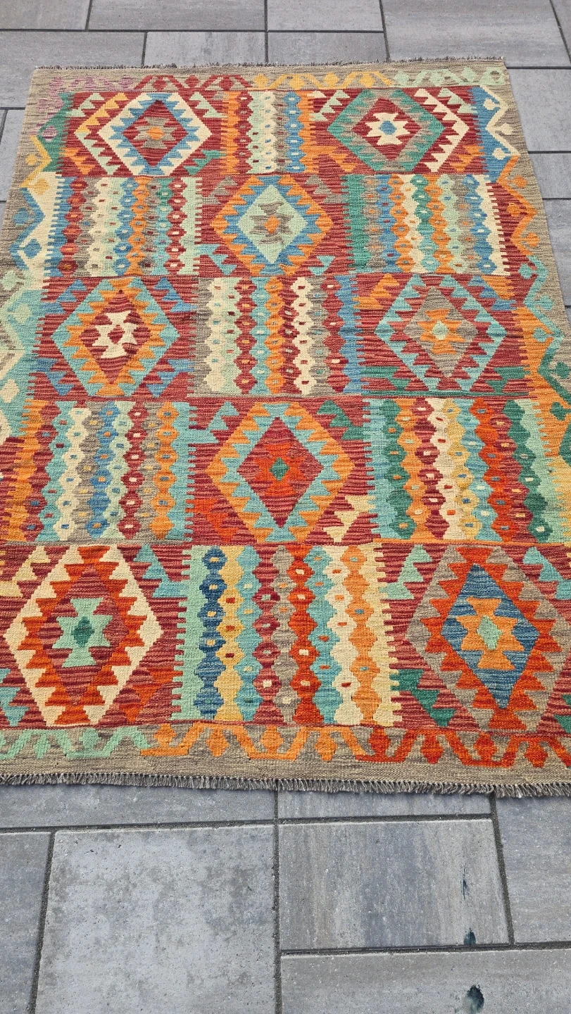 80This is a colourful area rug with a unique pattern. It would look great in any room!