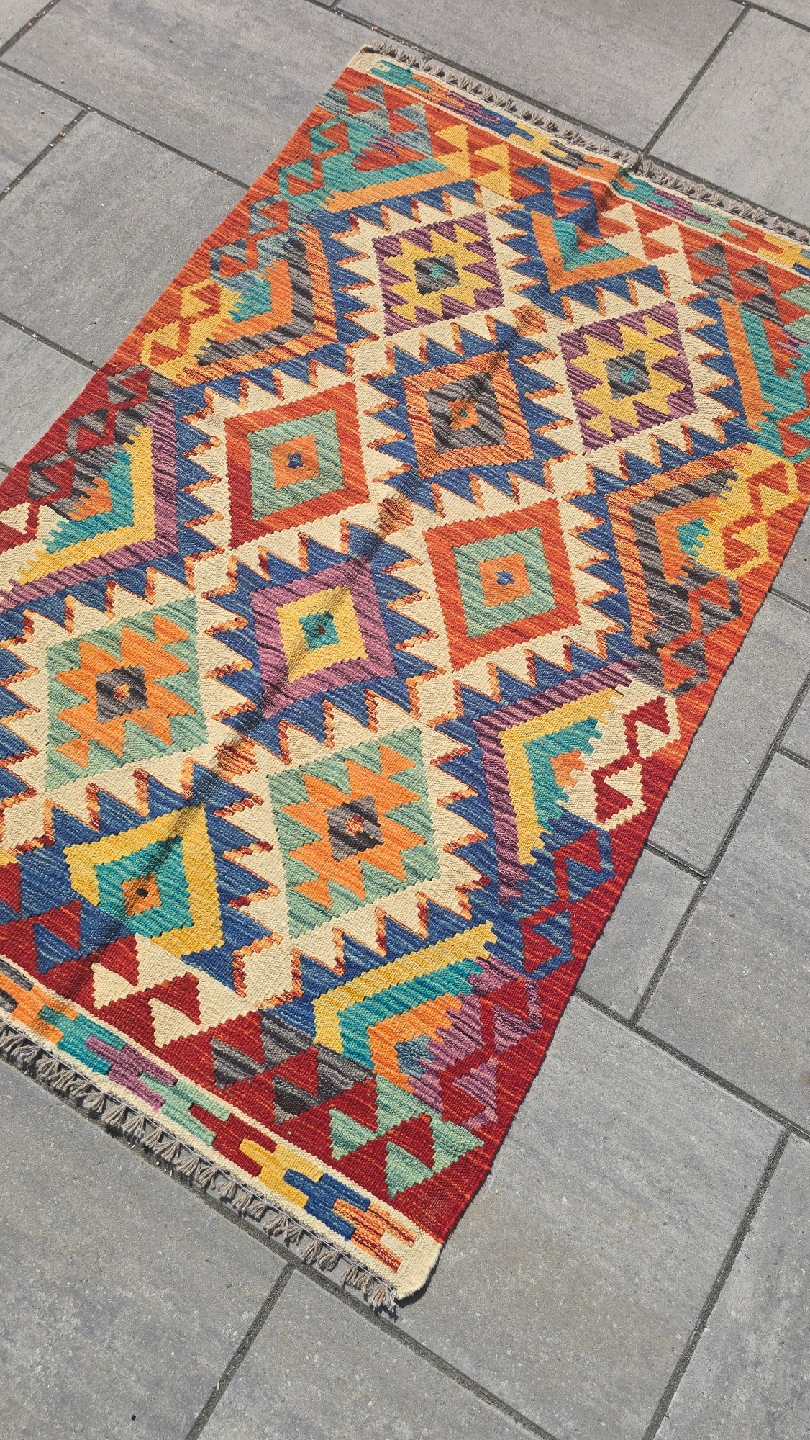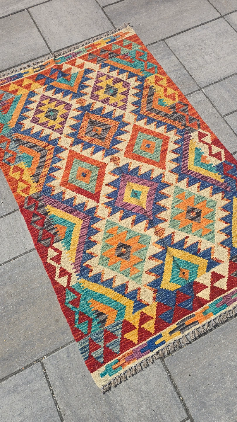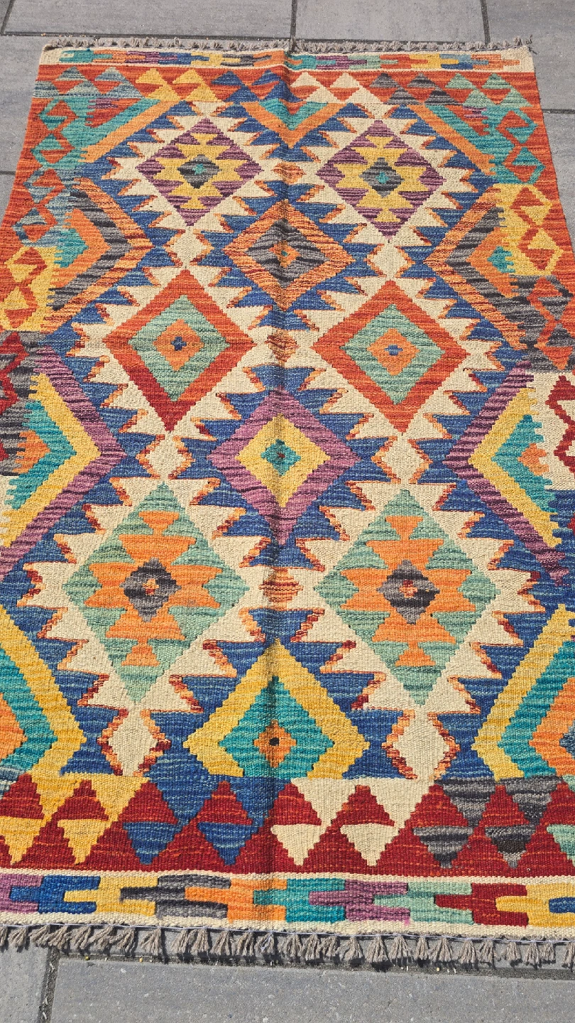 Selling a beautiful Kilim rug with a vibrant geometric pattern. The rug features a variety of colours including red, blue, yellow, and orange. It would be a great addition to any room!