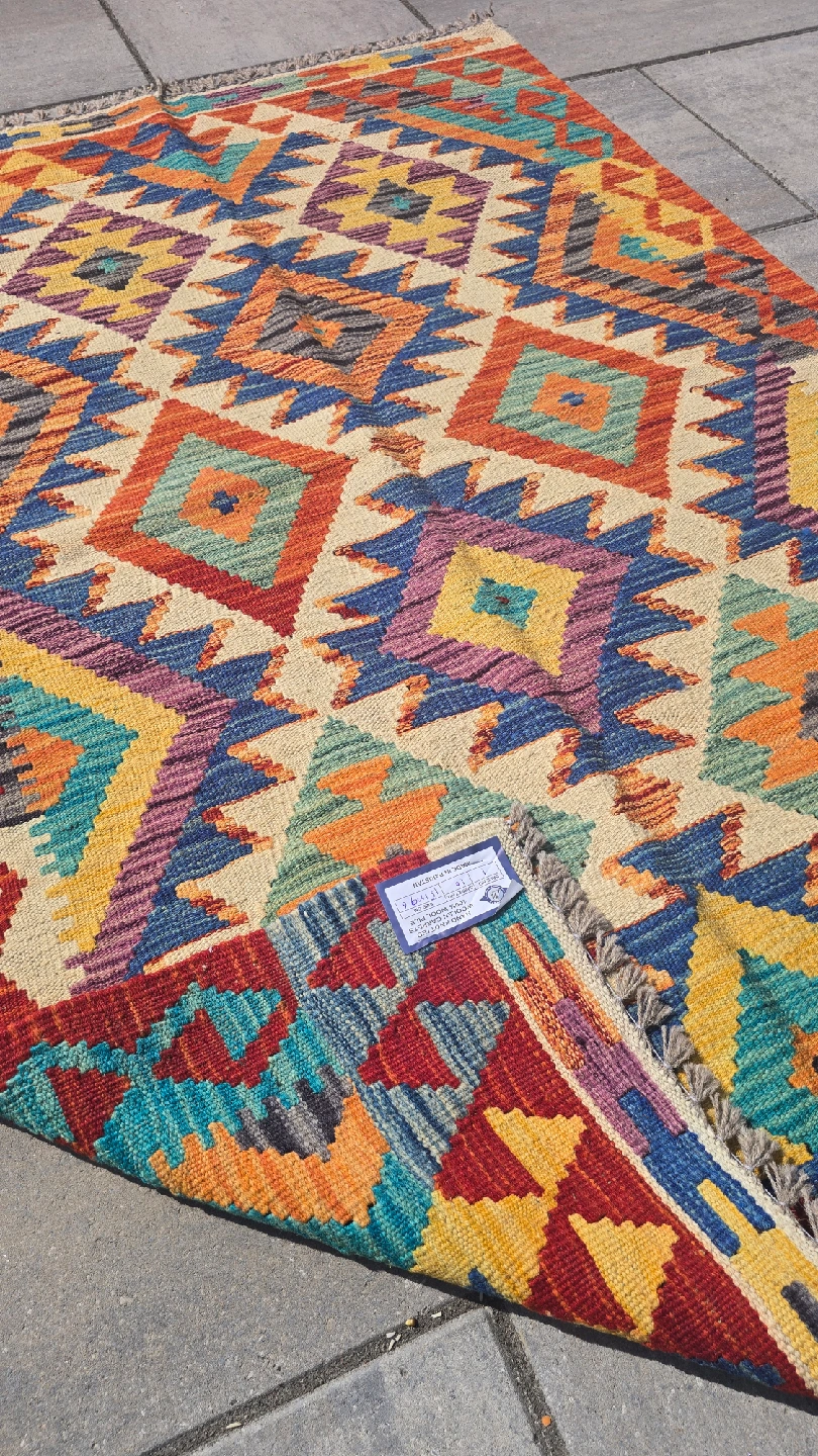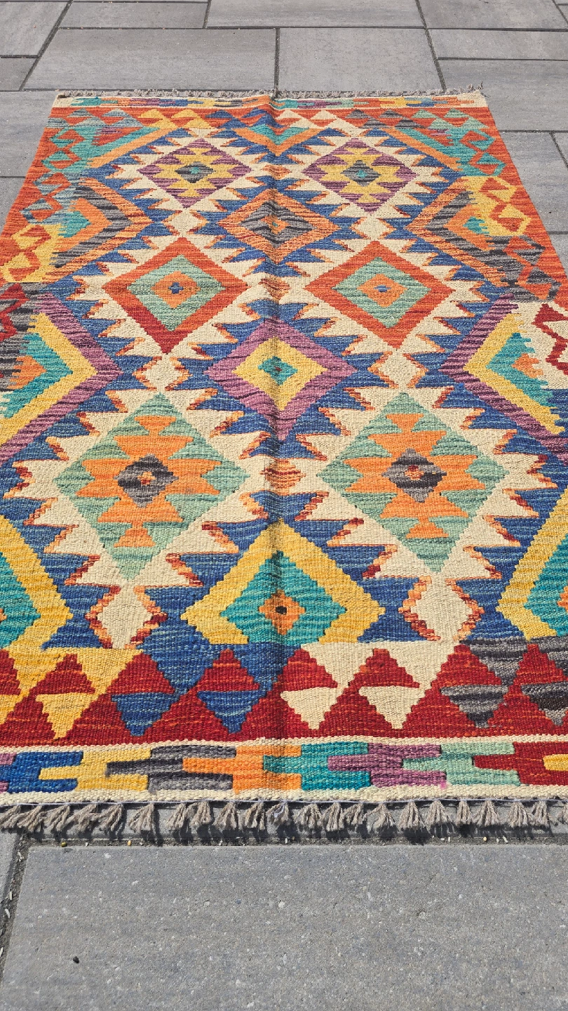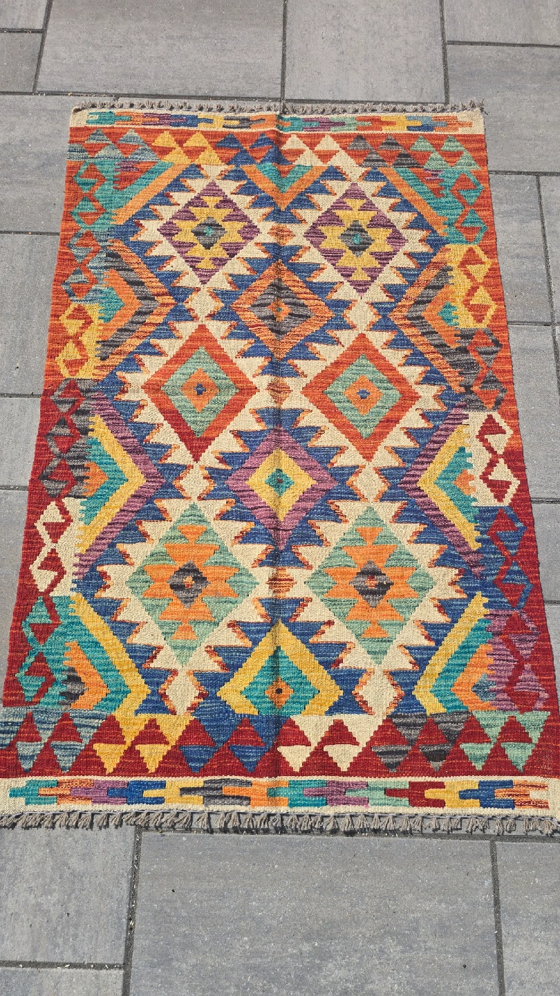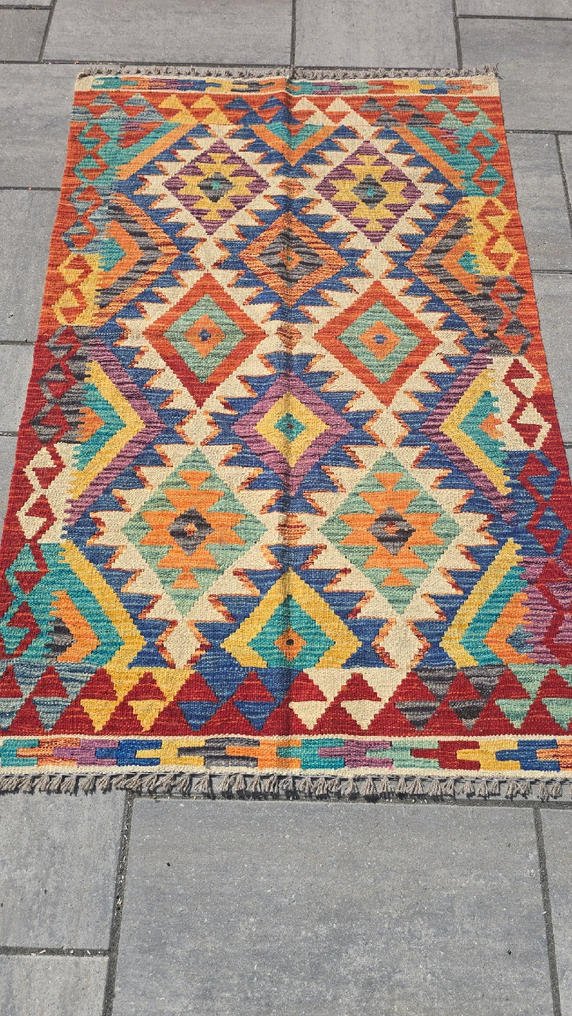 Selling a beautiful Kilim rug with a vibrant geometric pattern. The rug features a variety of colours including red, blue, yellow, and orange. It would be a great addition to any room!