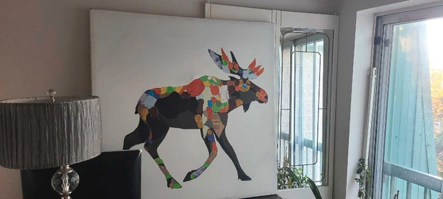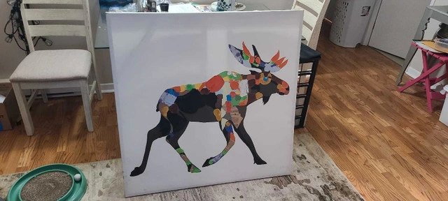 60Add a touch of creativity and Canadian charm to your space with this striking moose art piece! The painting features a black moose silhouette filled with bold, colorful abstract patches and collage textures, creating a unique and eye catching look. Perfect for a living room, cabin, office, or entryway — it’s a modern take on rustic wildlife art. Medium: Mixed media on canvas (paint and collage) Size: Large (approx. 40" x 40") Condition: Excellent Style: Modern, Abstract, Nature-inspired Colors: Black base with bright multicolor accents Ready to hang or display as-is. Price: $30 (or best offer) Pickup Location: Beamsville, ON