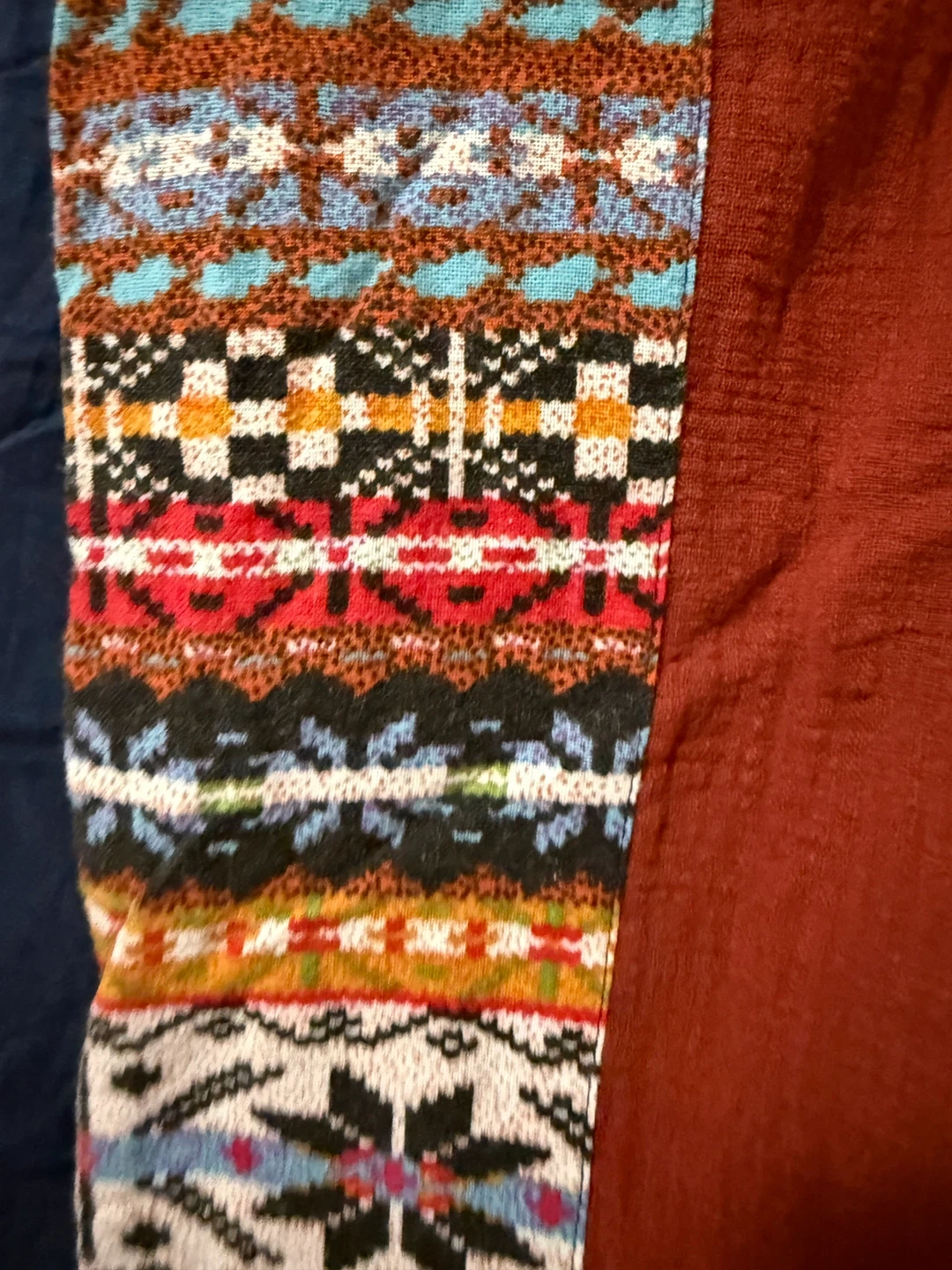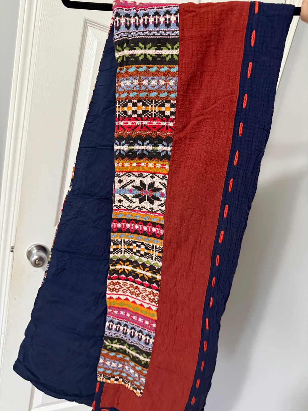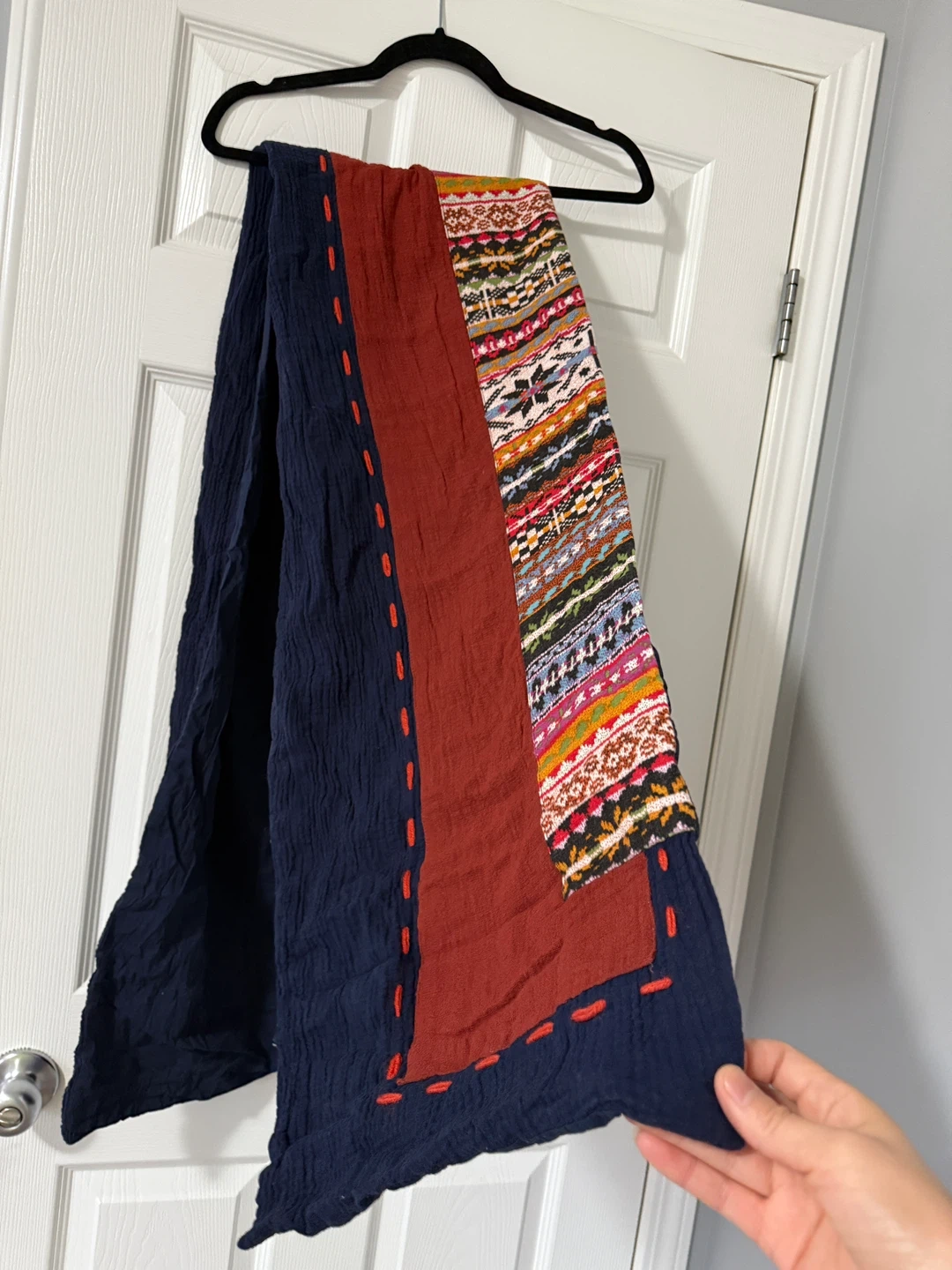 25Check out this beautiful scarf! It features a unique and colourful patterned design. Perfect for adding a pop of colour to any outfit and keeping warm on chilly days.