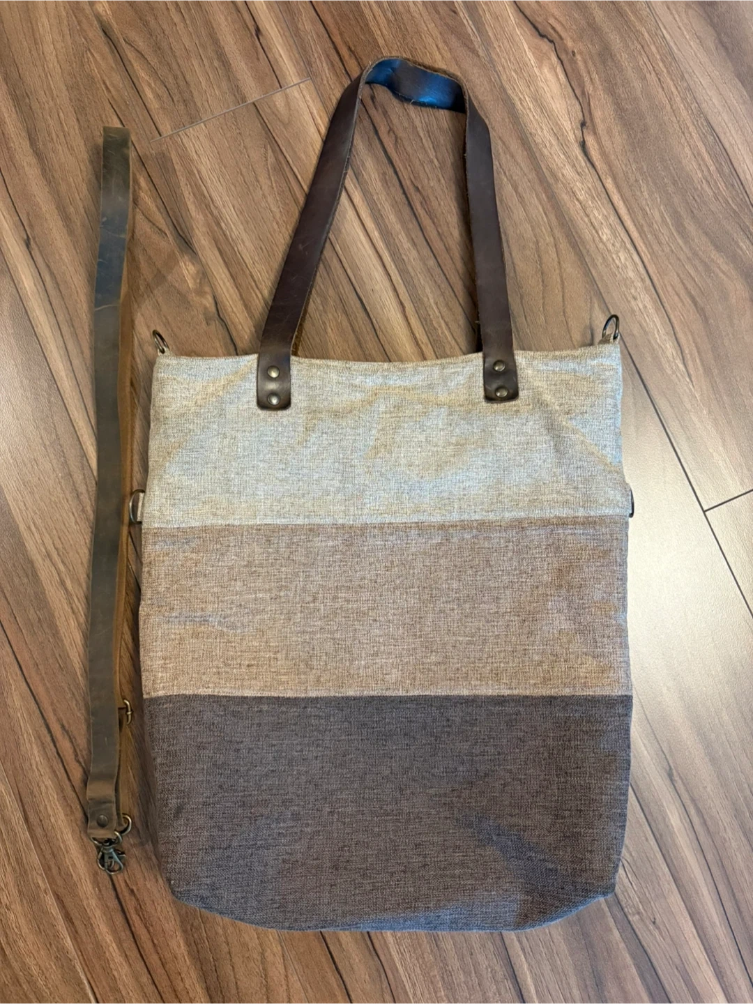 104Brown/Tan Tri-Color Twill Tote Bag purchased from Etsy. Converts to a crossbody bag with extendable strap. Both straps are made from genuine leather. Zippered interior with two slip pockets and a key chain clip. Well-made and great for everyday use. Shoulder strap length: 22” inches Extendable crossbody strap: 45” inches fully extended Bag L/W/H: 11.5”/ 3”/ 14.5” inches