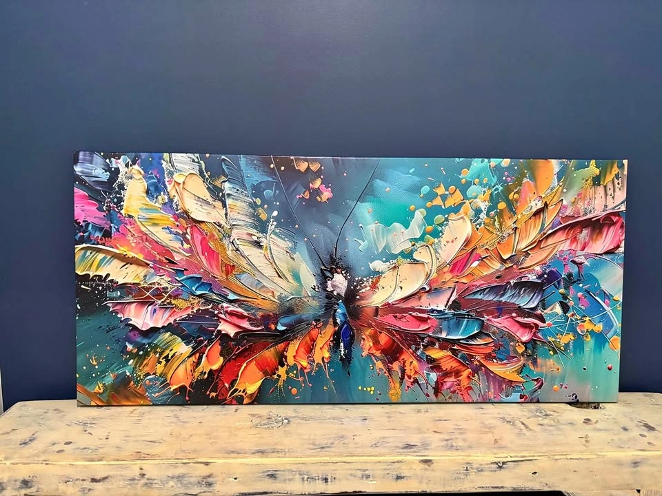 10Colourful abstract butterfly print on canvas. Framed on 43.25”X19.75”X1.5” wooden frame. Ready to hang with two saw tooth hangers attached. Pick up in North Bowmanville near Middle Rd and Northglen Blvd. Check out my other listings for more canvases!!